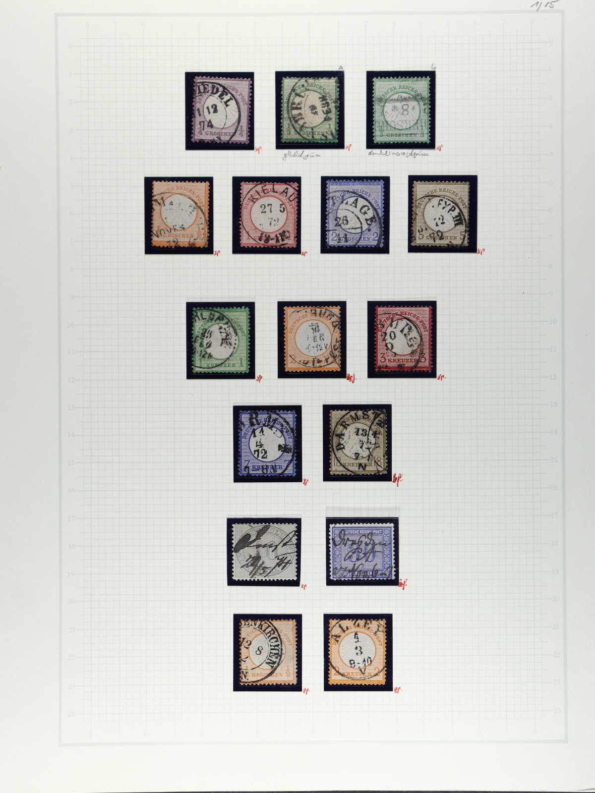 3166 gest. imageDEUTSCHES REICH BRUSTSCHILD: 1872/74, gestempelte Sammlung, in den Hauptnummern komplett, dazu kommt die Farbvariante Mi-Nr. 21 b, zusammen 29 Marken, bis auf eine BPP-geprüft, enthalten Fotobefunde für Mi-Nr. 11, 13, 21 b, 28 und 30 (3 aus 2022/23), die Qualität ist wie üblich unterschiedlich, Katalogwert n.A.d.E. 8.045,- Euro, eine Auflistung liegt bei (Image) (imagea) (imageb) (imagec)