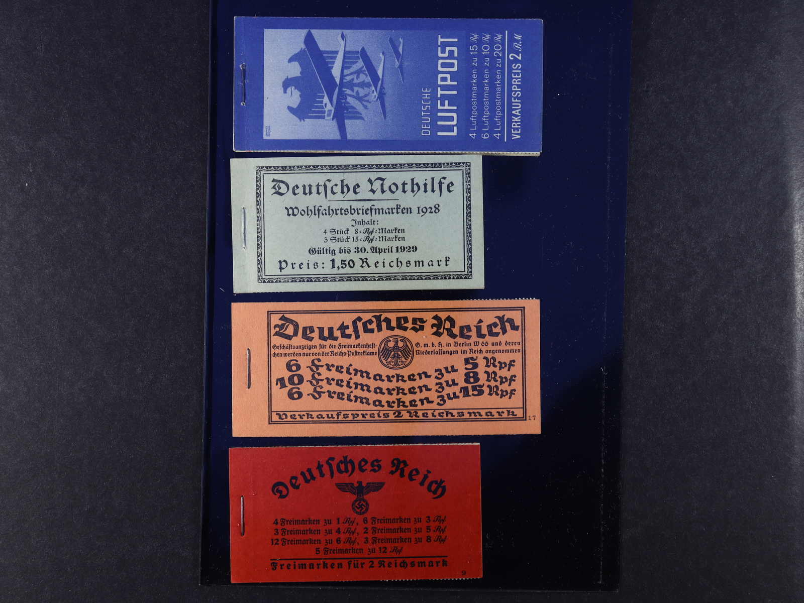 3164 og imageDEUTSCHES REICH MARKENHEFTCHEN: 1928/39, 4 bessere ungebrauchte Markenheftchen, dabei MH 19, MH 25.11, MH 27.3 und MH 38.1, Marken teils etwas gelbfleckig, sonst einwandfrei, Katalogwert ca. 3.000 Euro (Image)