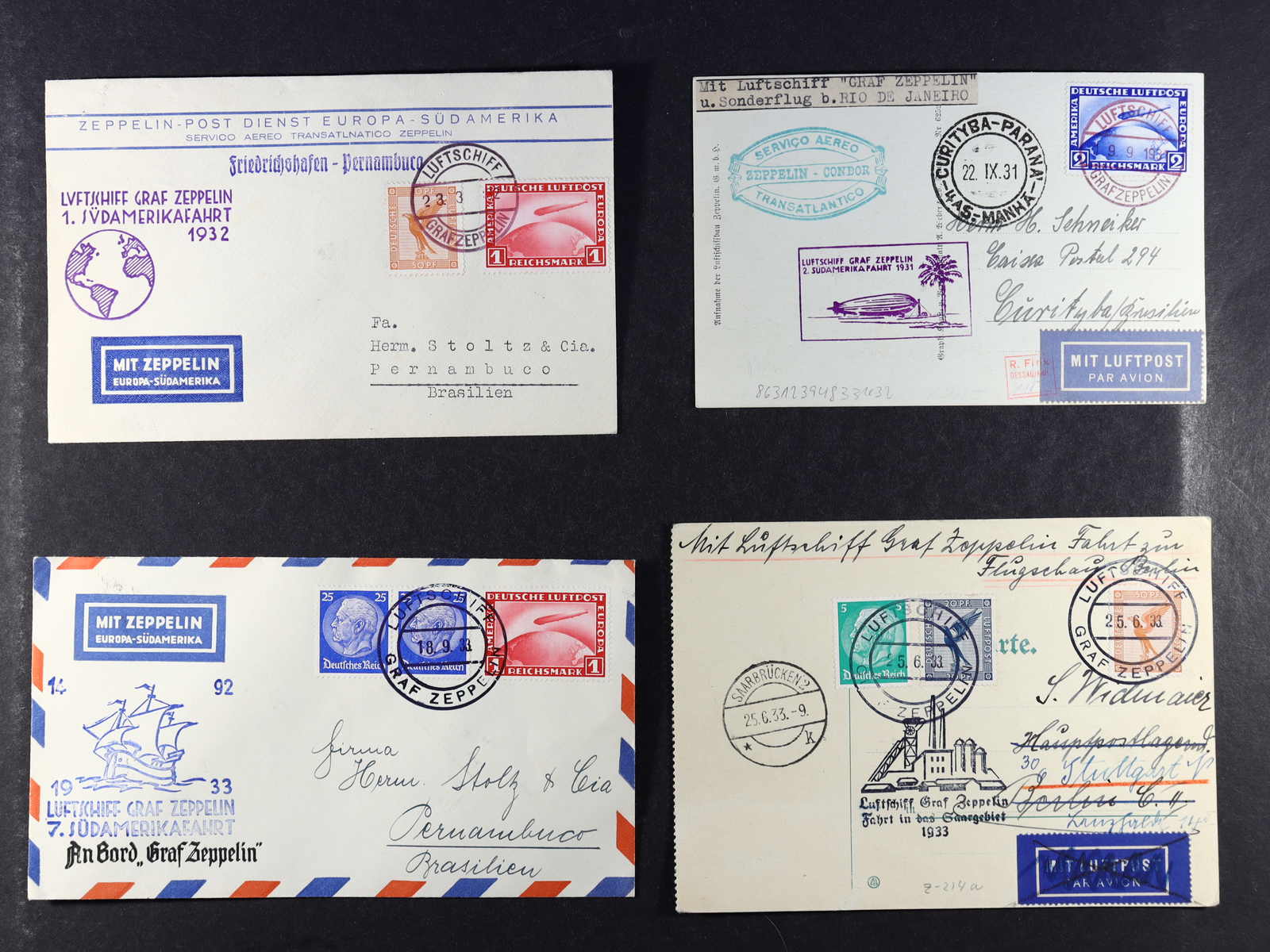 3210 Brief imageDEUTSCHES REICH: 1931/33, kl. Posten Zeppelinbriefe/Karten, dabei Bordpost der Ostsee-Rundfahrt 1931 (Landung Travemünde), 2. Südamerikafahrt 1931, 1. Südamerikafahrt 1932, Fahrt ins Saarland 1933 und Bordpost der 7. Südamerikafahrt 1933, dazu eine Postkarte zur Islandfahrt 1931, Brief zur 9. Südamerikafahrt 1932, 2 Briefe der 1. Südamerikafahrt 1933, ein Brief der 3. Südamerikafahrt 1933 und ein Brief zu Chicagofahrt 1933, alle Belege mit den entsptrechenden Sonder- und Bestätigungsstp., meist mit Luftpost- oder Zeppelinmarken frankiert, ges. 11. Belege in guter Qualität, bitte besichtigen (Image) (imagea) (imageb)