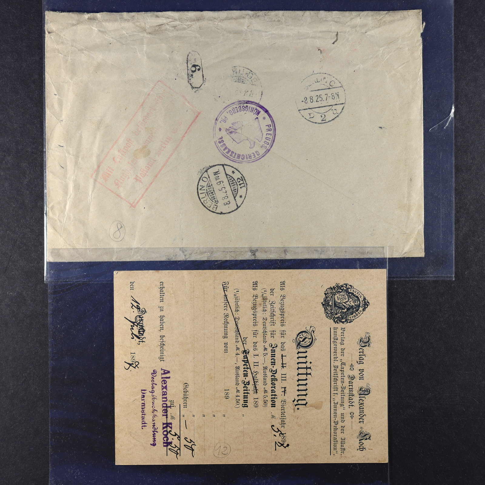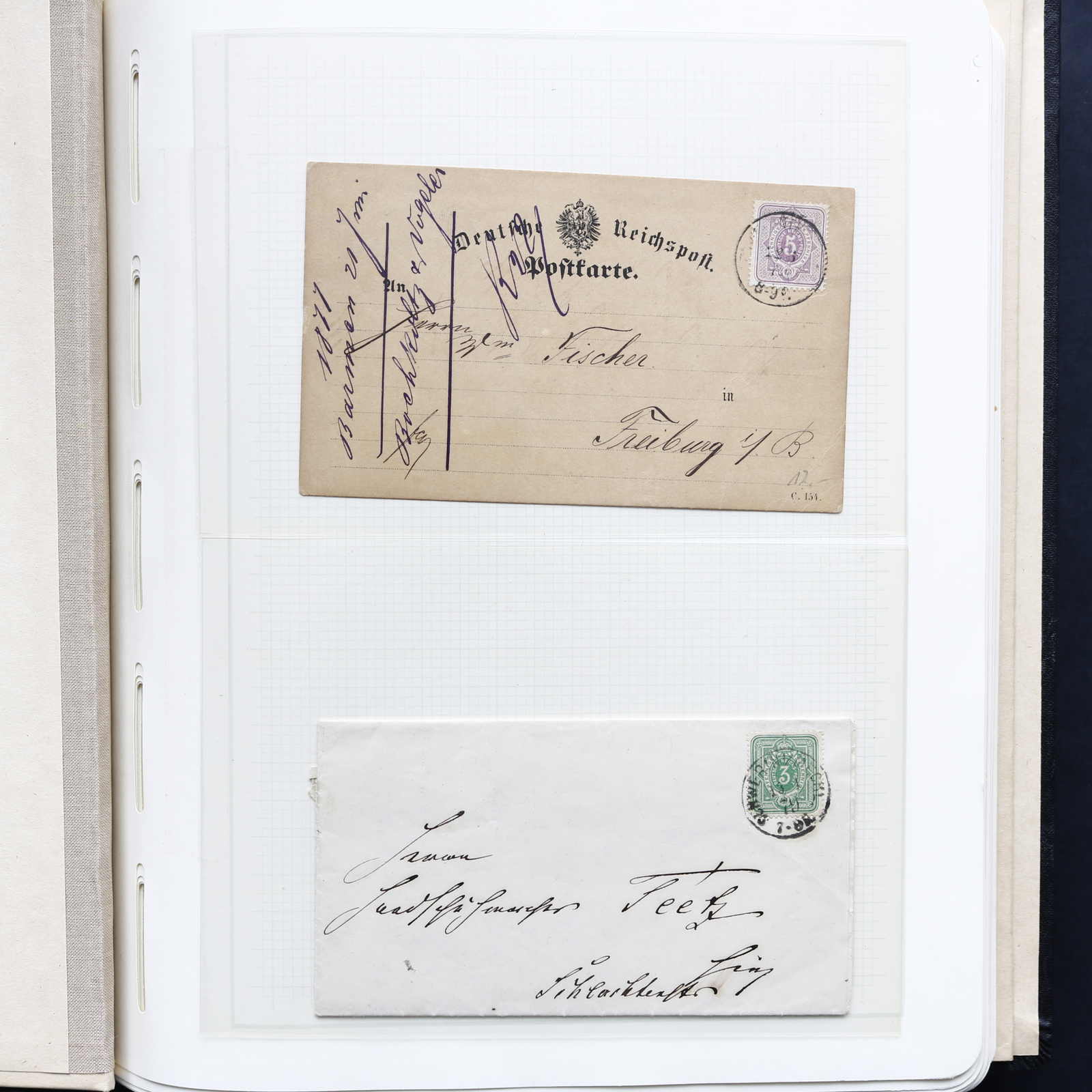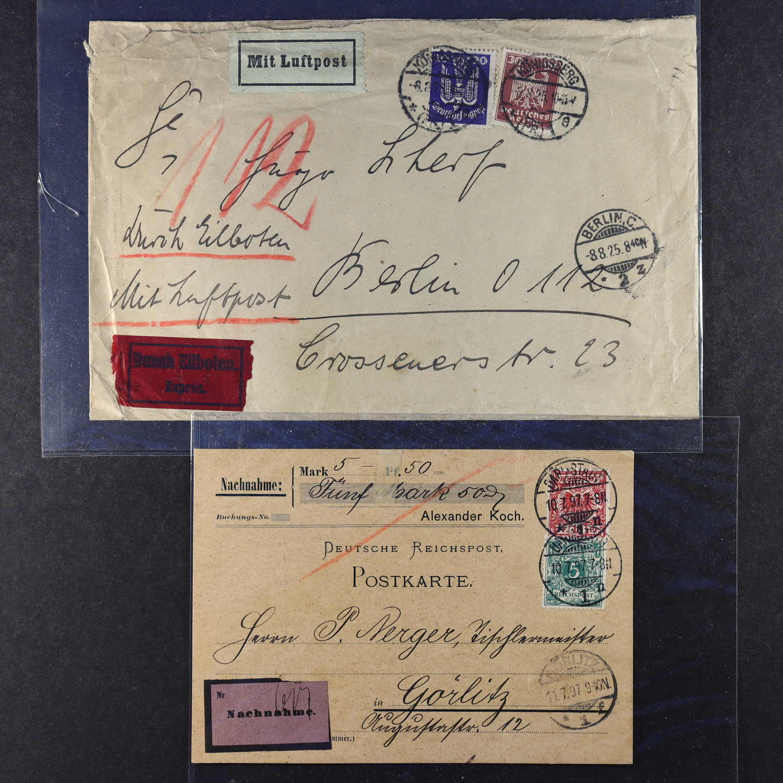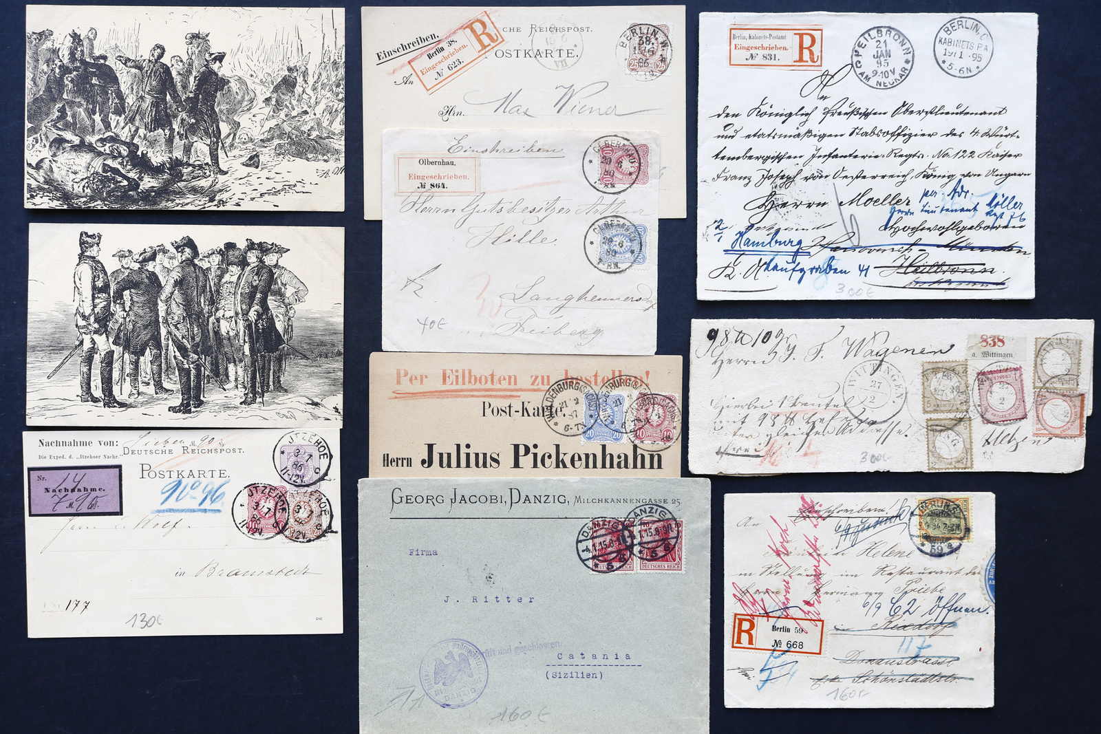 3211 Brief imageDEUTSCHES REICH: 1872/1915, kl. Posten Briefe/Postkarten, dabei ein Paketbegleitbrief aus Wittingen nach Uelzen mit einer Brustschild-Frankatur von 16 1/2 Gr., 4 Belege mit Pfennig-Frankaturen, dabei eine Expresskarte, eine Nachnahme-Postkarte und eine Ortspostkarte per Einschreiben, ein portofreier Einschreibbrief königl. Angelegenheit, aufgegeben beim Kabinetts-Postamt in Berlin, 2 Belege mit Germania-Frankaturen und 2 Postkarten des Kunstverlags Ackermann München mit Darstellungen von Friedrich dem Großen in den Schlachten bei Leuthen und bei Torgau, ges. 10 interessante Belege in guter Qualität (Image)