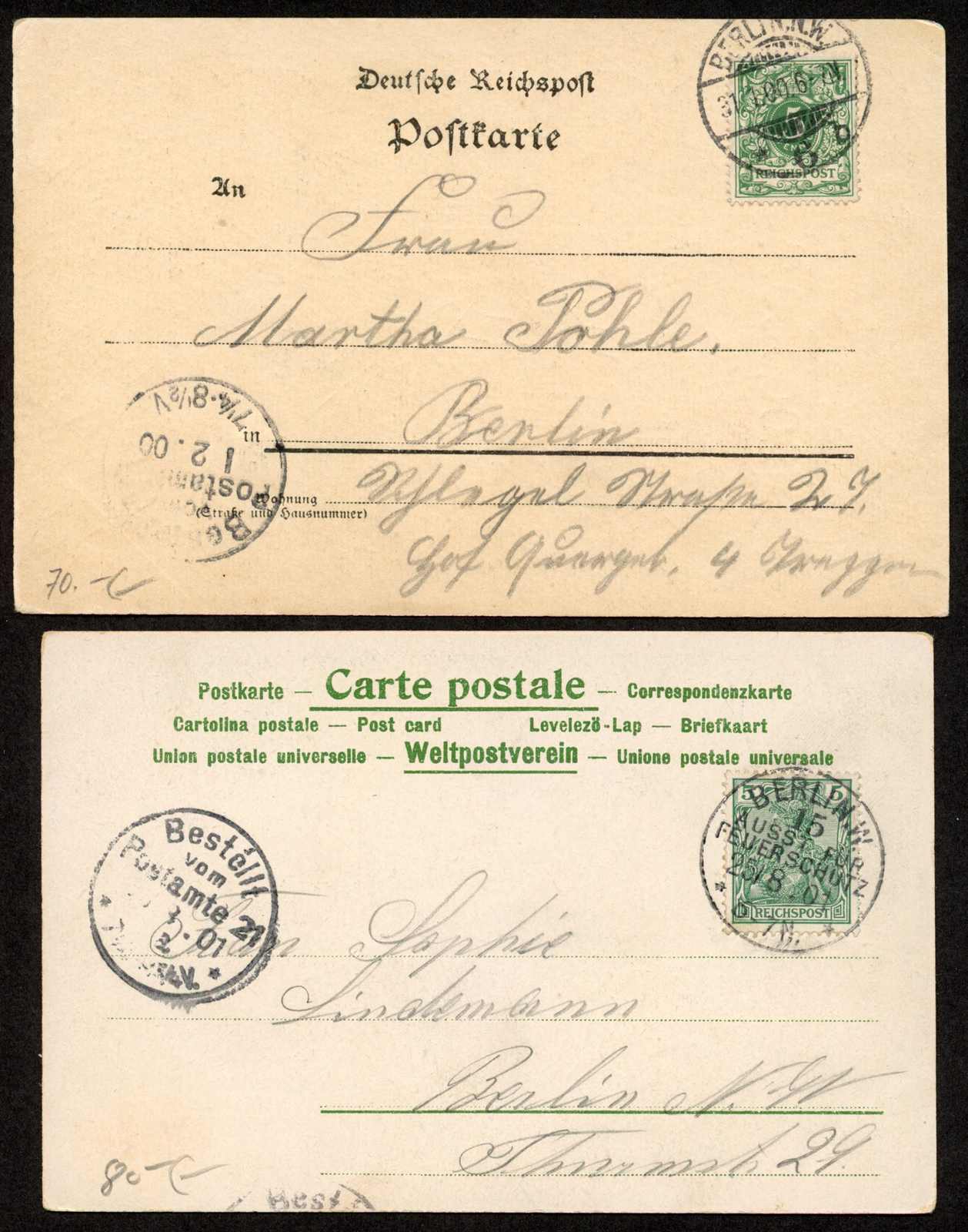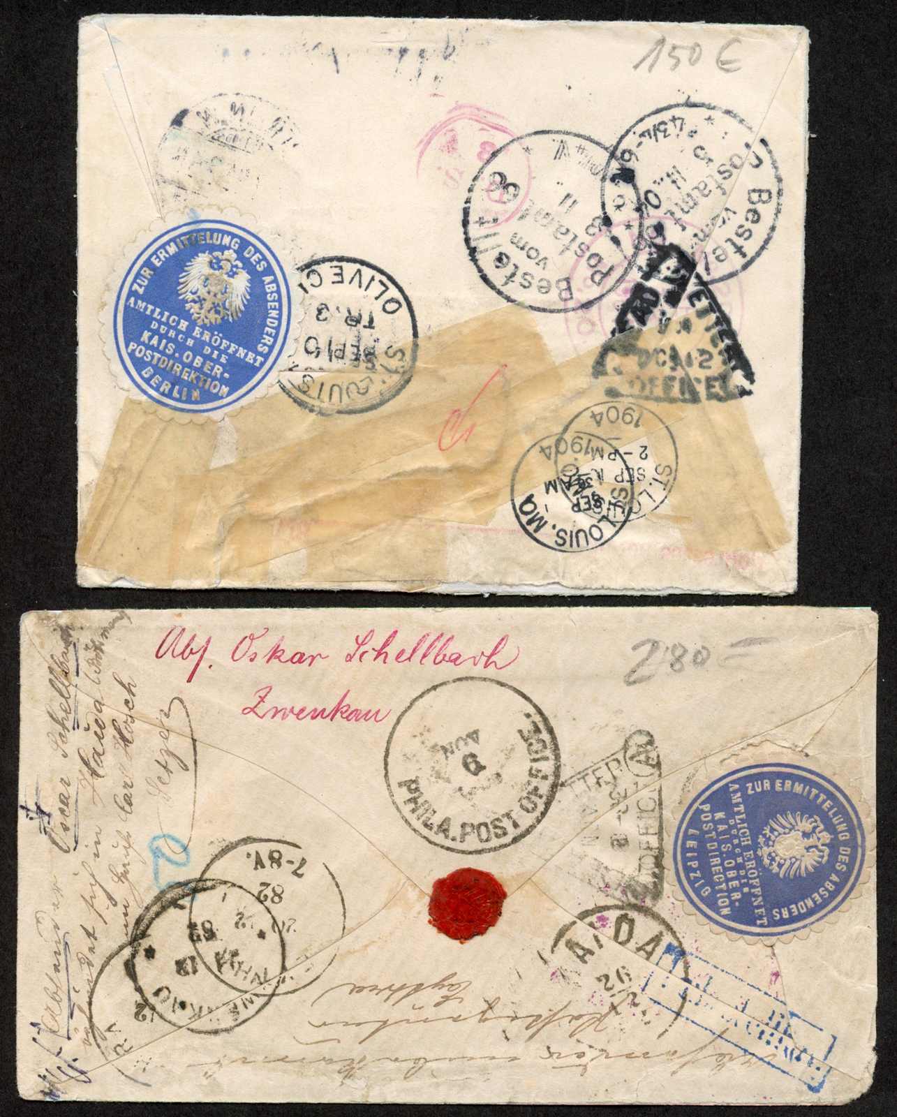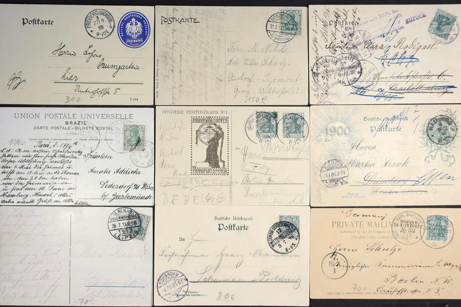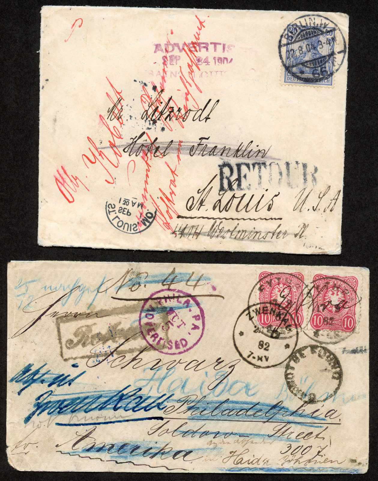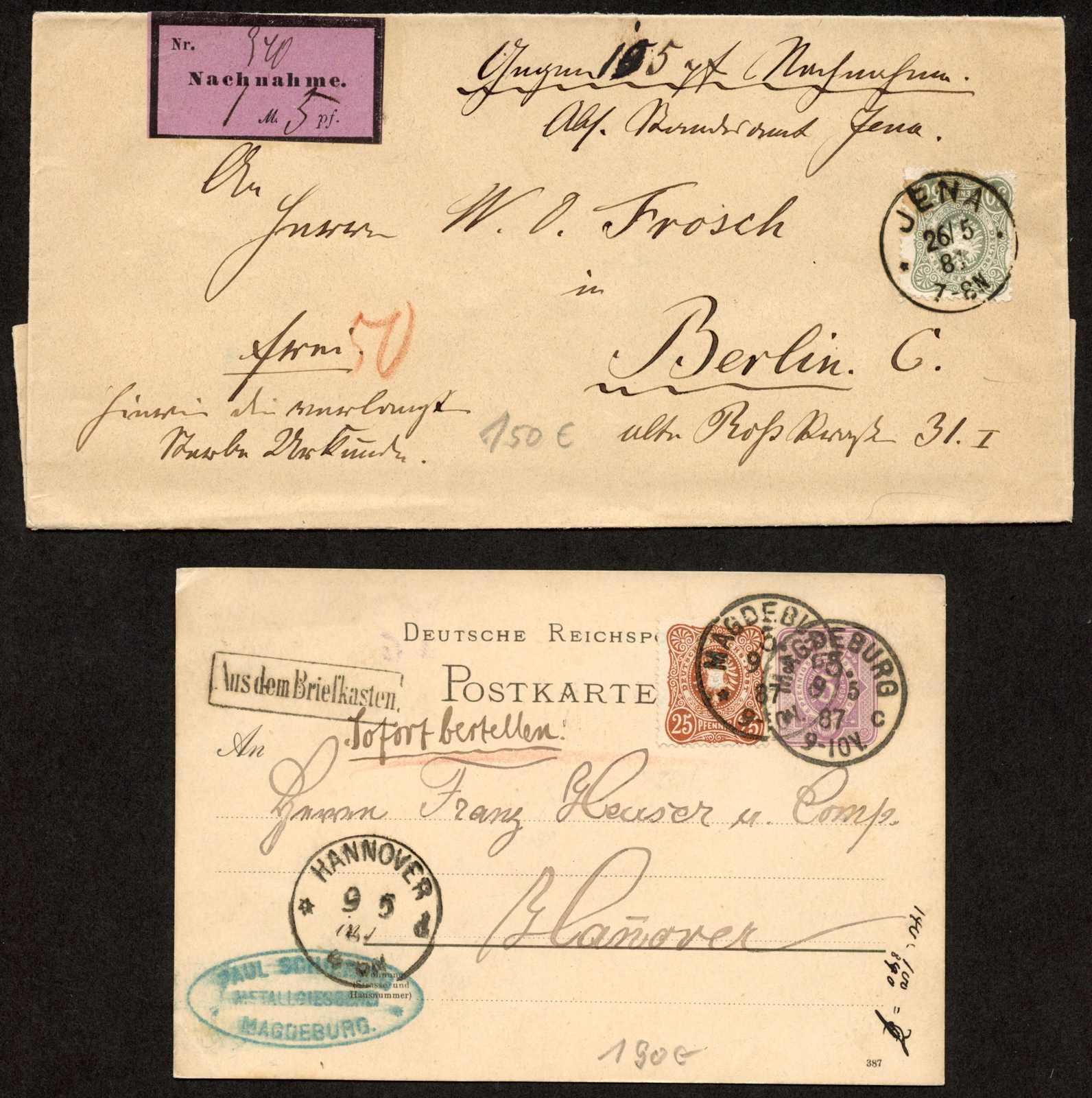 3212 Brief imageDEUTSCHES REICH: 1880/1910 ca., schöner Posten von acht sauberen Belegen Pfennig - Germania, dabei Faltbrief mit EF Mi-Nr. 44 a per Nachnahme, MeF Mi-Nr. 41 nach Philadelphia und retour amtl. eröffnet, Eilbotenkarte mit MiF Mi-Nr. 43 mit P 18 I "Aus dem Briefkasten", 3x Sonderstempel auf Germania, Mi-Nr. 46 auf Karte "Berliner Morgenpost 200.000 Abonnenten" und Mi-Nr. 71 EF nach St. Louis + retour amtl. eröffnet, saubere Qualität (Image) (imagea) (imageb) (imagec) (imaged) (imagee) (imagef) (imageg)