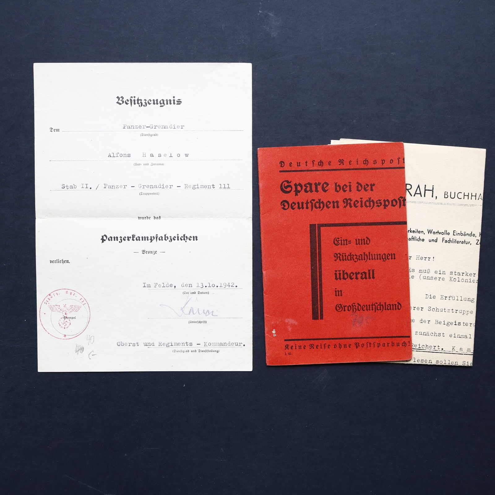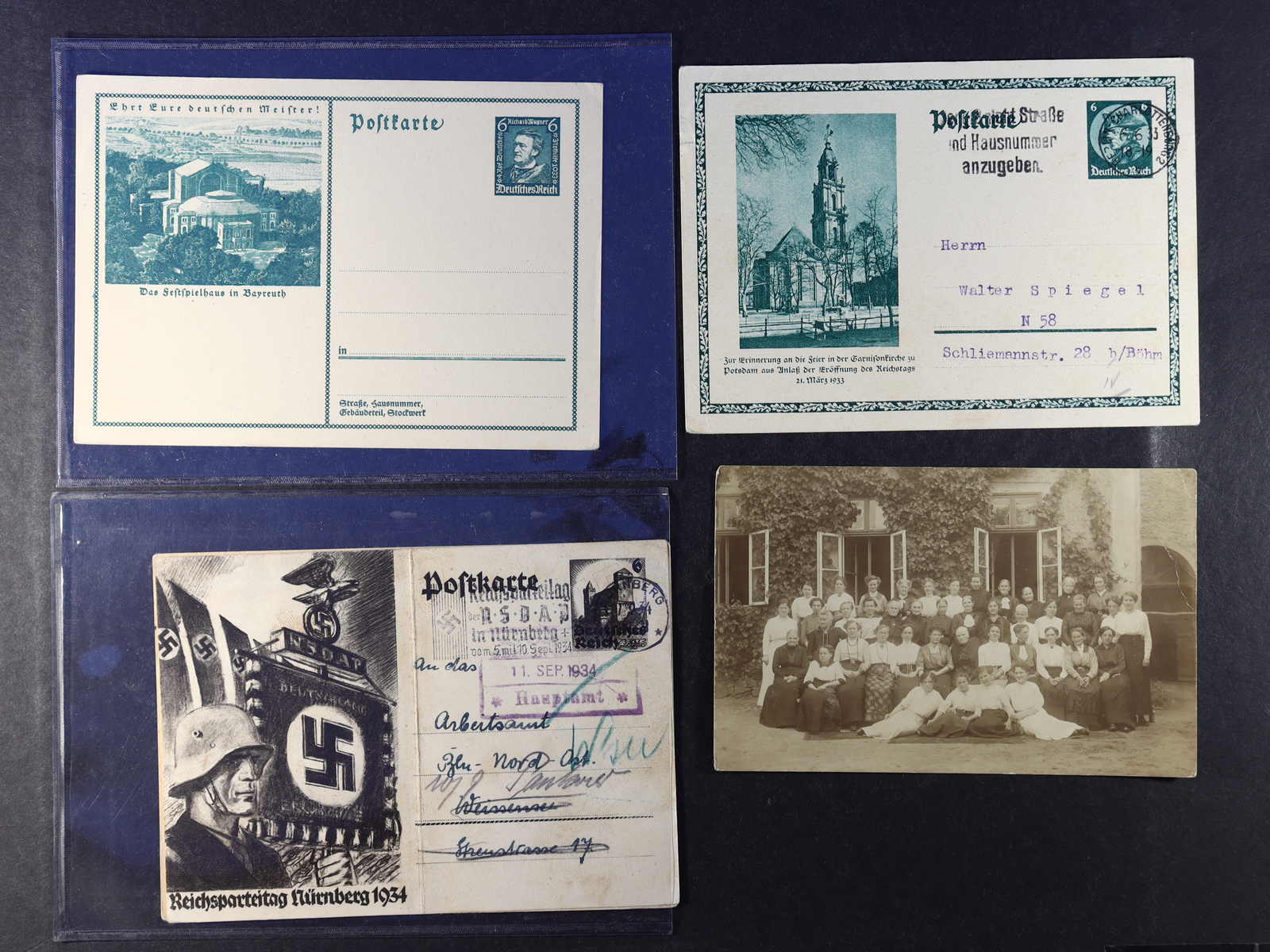 3204 Brief imageDEUTSCHES REICH: 1933/42, Posten Ganzsachen, Bildpostkarten, Fotokarten und Propagandakarten, dabei teils seltene Karten und etwas Privatpostkarten, dazu 3 Dokumente, u.a. Besitzzeugnis für ein Panzerkampfabzeichen in Bronze, interessanter Posten in guter Qualität (Image) (imagea) (imageb) (imagec) (imaged)
