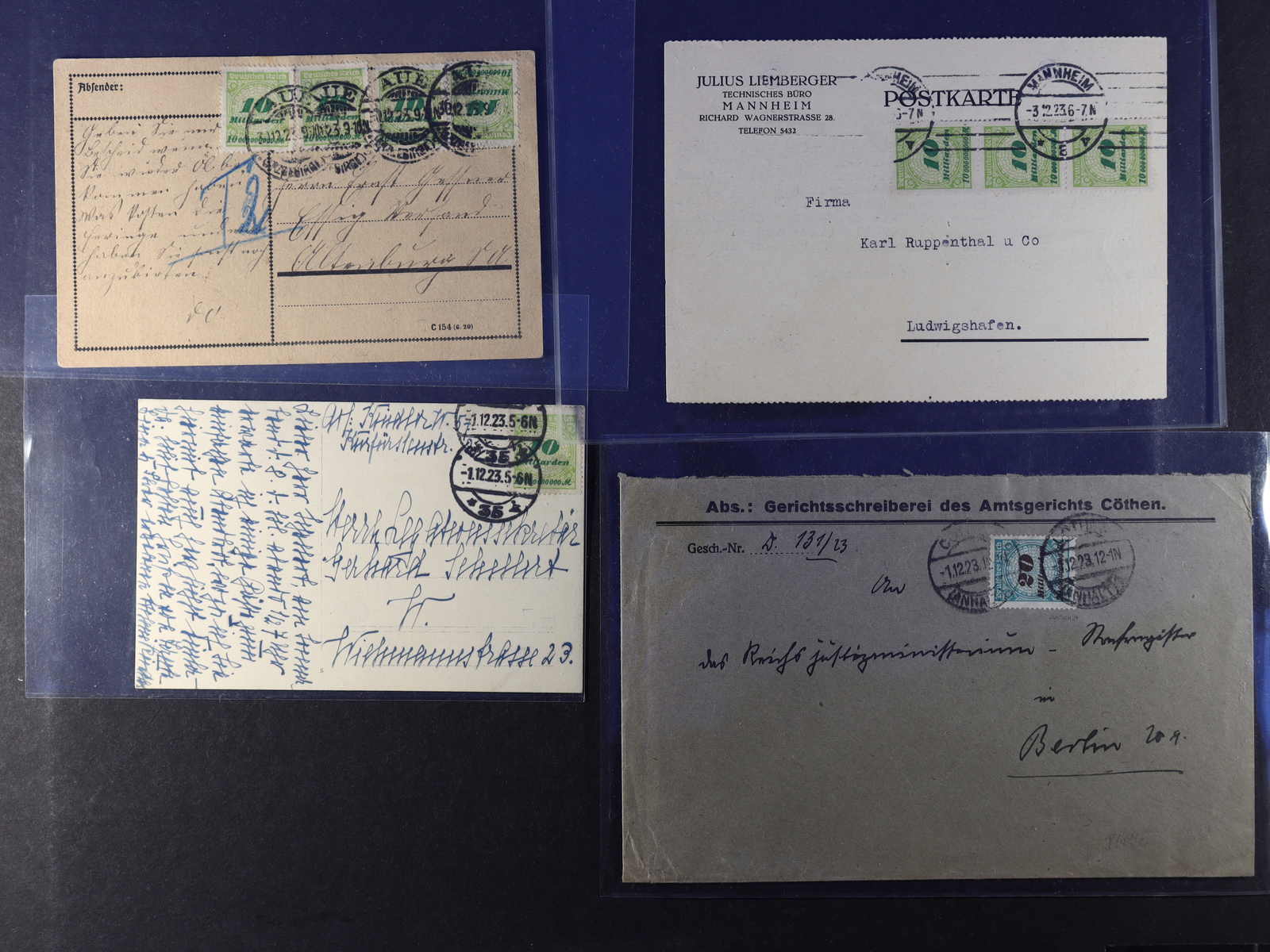 3214 gest., Brief imageDEUTSCHES REICH INFLA: 1919/23, 35 Briefe, Karten und Ganzsachen sowie eine Paketkarte, teils mit Zusatzleistungen, u.a. Eil-Ortspostkarte im 32 1/2 Pfg.-Tarif, 2 bessere Einzelfrankaturen (Mi-Nr. 145 aI und 146 I) sowie 7 Dezemberbelege, dazu Viererblock mit Schiffspoststempel Hamburg-Südamerika, meist einwandfreie Qualität (Image) (imagea) (imageb) (imagec) (imaged) (imagee) (imagef) (imageg) (imageh) (imagei)