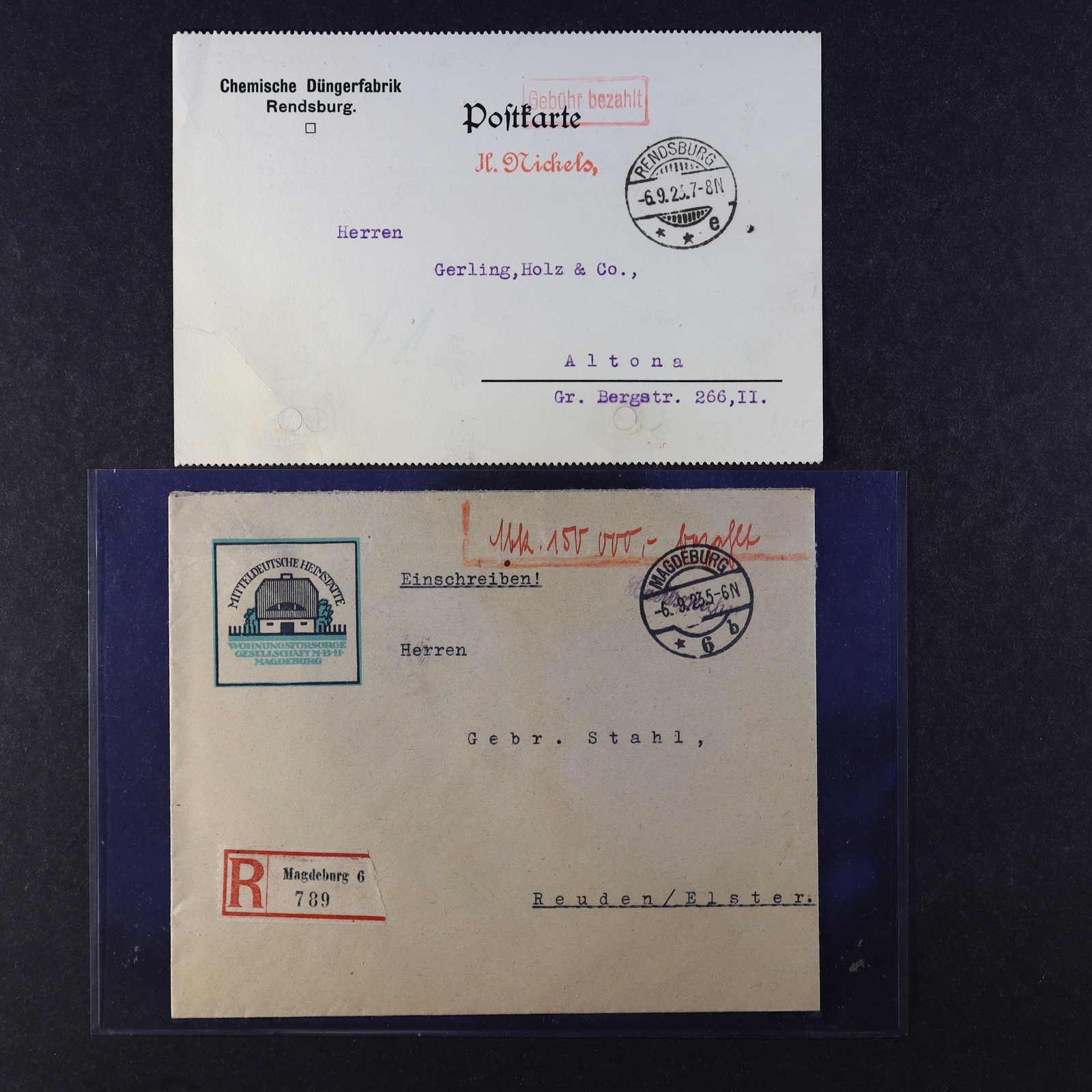 3219 Brief imageDEUTSCHES REICH INFLA POSTMEISTERSTEMPEL: 1923, 4 bar freigemachte Belege mit Postmeisterstempel, dabei Hülse (Berthelsdorf Kr. Hirschberg), Vollmer (Hüsten), Breitsprecher (Magdeburg) und Nickels (Rendsburg), meist gute Bedarfsqualität, eine Karte geschlossene Aktenlochung (Image) (imagea)