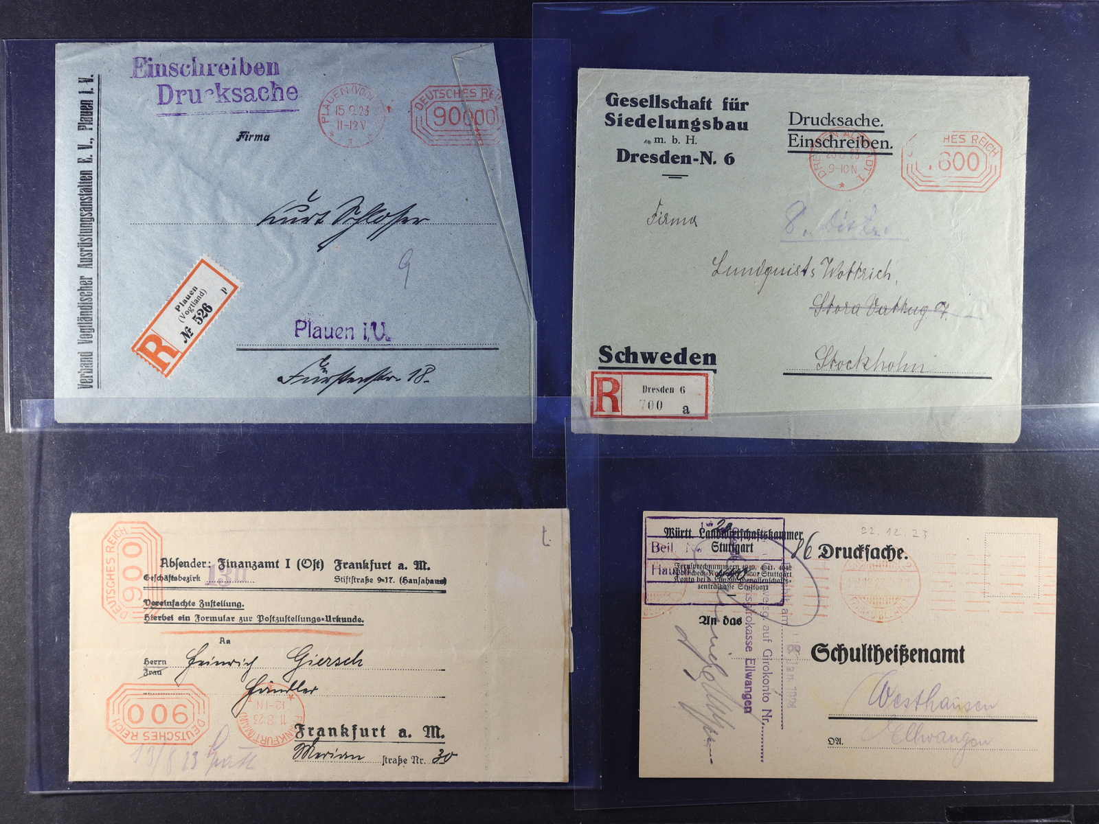 3220 Brief imageDEUTSCHES REICH INFLA GEBÜHR BEZAHLT/POSTFREISTEMPEL: 1910/23, 16 bar freigemachte Briefe, Karten sowie eine Paketkarte mit versch. Gebühr bezahlt-Stempeln, einmal von 1910, sonst aus der Inflationszeit, dazu 3 Postfreistempelbelege aus der Hochinflation, hierbei Auslands-R-Drucksache, Doppelabschlag auf Zustellungsurkunde und Teilabschlag auf Umschlagrückseite durch umgeschlagene Kuvert-Ecke, durchschnittliche Qualität (Image) (imagea) (imageb) (imagec) (imaged)
