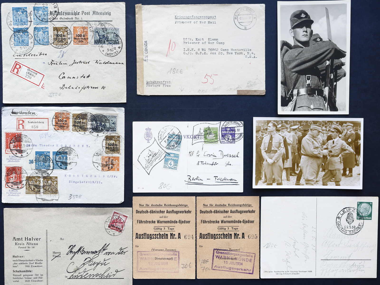3215 Brief imageDEUTSCHES REICH: 1922/44, kl. Posten Briefe und Postkarten, dabei 2 Einschreibbriefe mit Mi-Nr. 258/60 und Zusatzfr. im Inland befördert, eine 15 Pfg. Ganzsache (Hindenburg) mit Zusatzfr. als Expresskarte nach Basel, eine P 264 (Danzig-Aufdruck) mit Bedarfstext, etwas Propaganda vom III. Reich und 2 Postkarten, befördert mit der dt. Seepost aus 1936, interessanter Posten, gute Qualität (Image) (imagea)