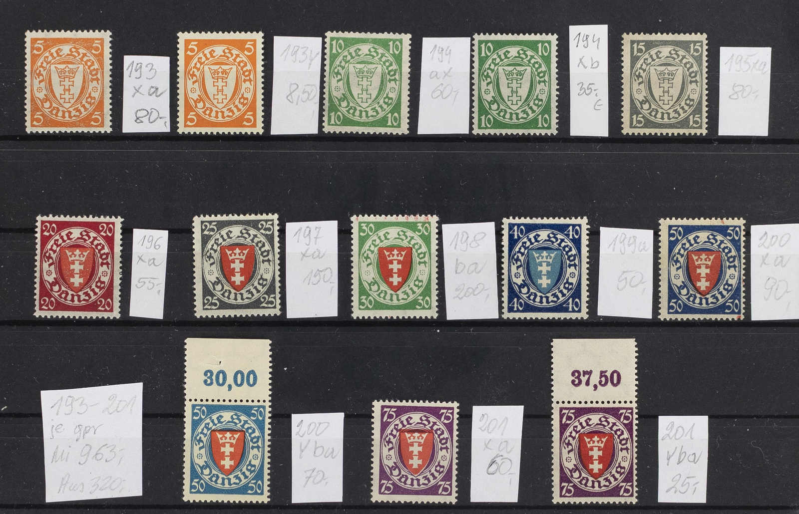 DANZIG: 1924, Zusammenstellung von 13 postfrischen Marken mit geprüften Farbvarianten, dabei Mi-Nr. 193 xa, y, 199 xa, xb, 195 xa, 196 xa, 197 xa, 198 ba, 199 a, 200 xa, 200 yba, 201 xa und 201 yba, 200 und 201 yba jeweils vom