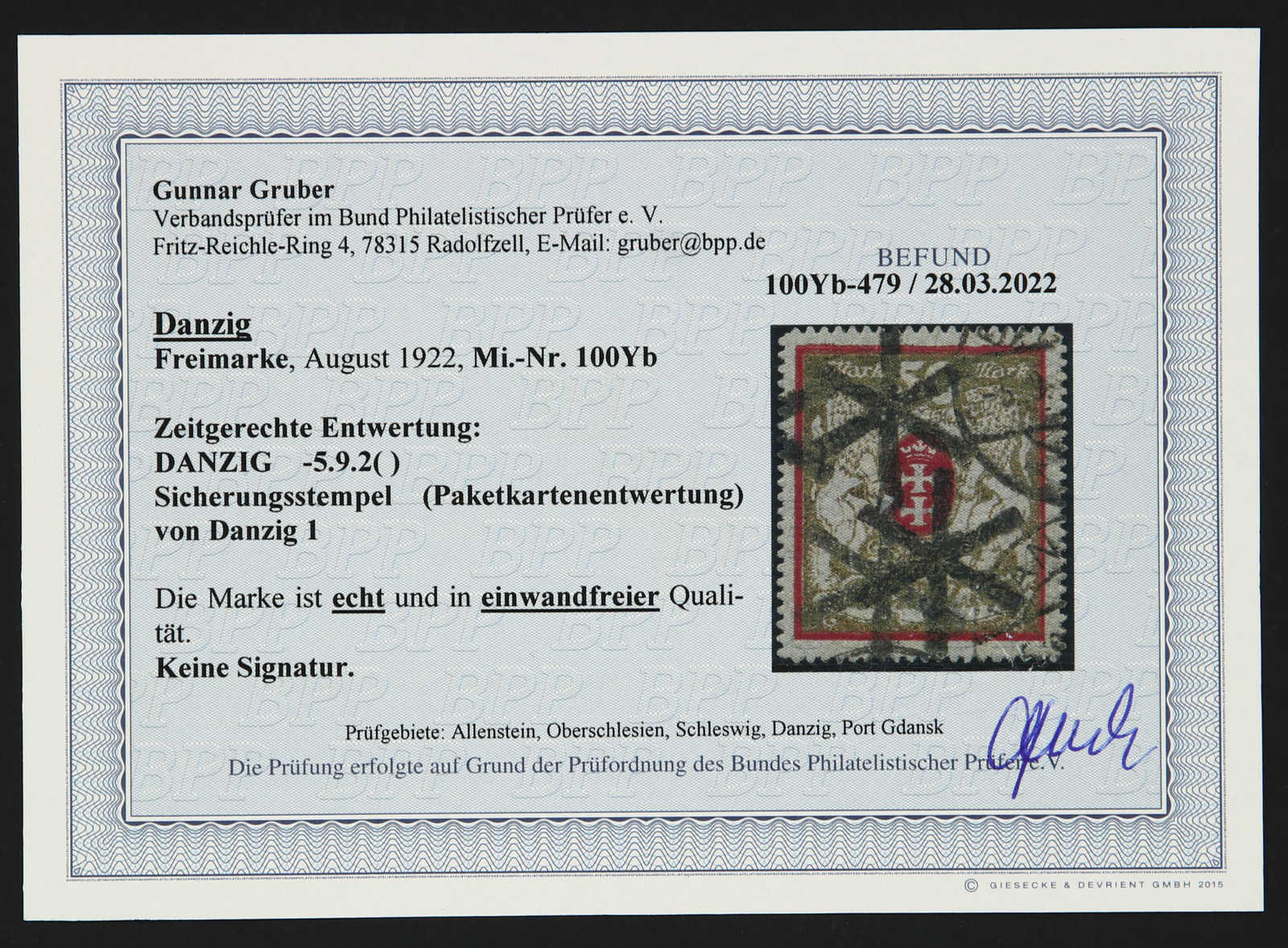 DANZIG: 1920/39, 34 gestempelte geprüfte Werte, dabei bessere wie Mi-Nr. 27 II, 109 b, 100 Y b Fotobefund Gruber BPP 03/2022, 163 (rötl. Verfärbung), 296, D 31 x, D 40 und P 13 a, Katalogwert ca. 2.760 Euro, meist gute Qualität (Image) (imagea)