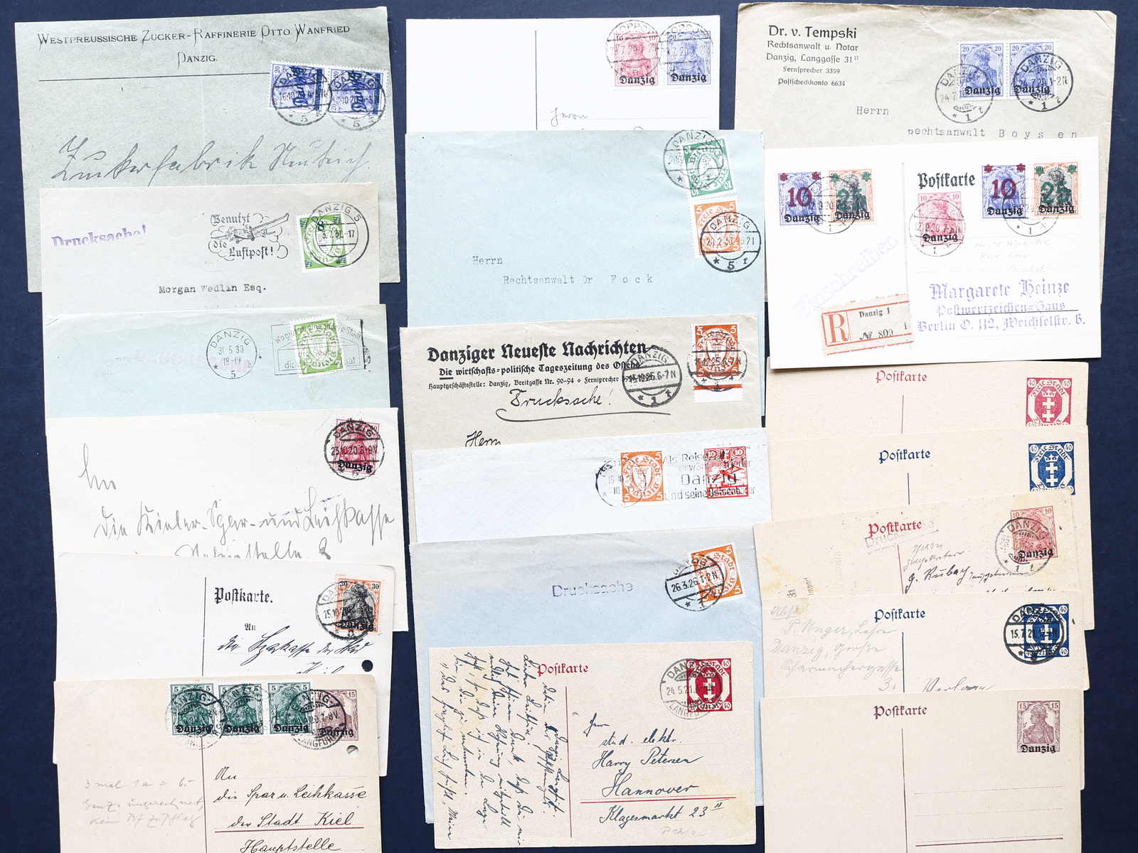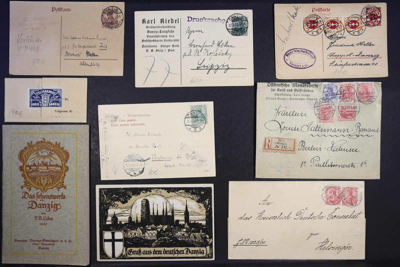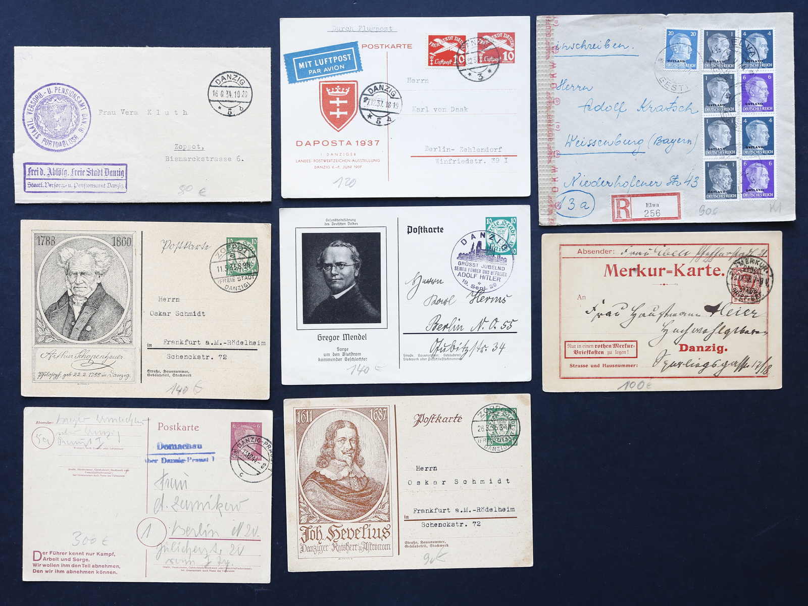 DANZIG: 1901/44, interessanter Posten Briefe und Postkarten, dabei Vor- und Nachläufer mit Frankaturen des Deutschen Reiches mit teils besseren Portostufen, Ganzsachen, teils mit Zusatzfrankatur und Propaganda, bessere Einzel- und