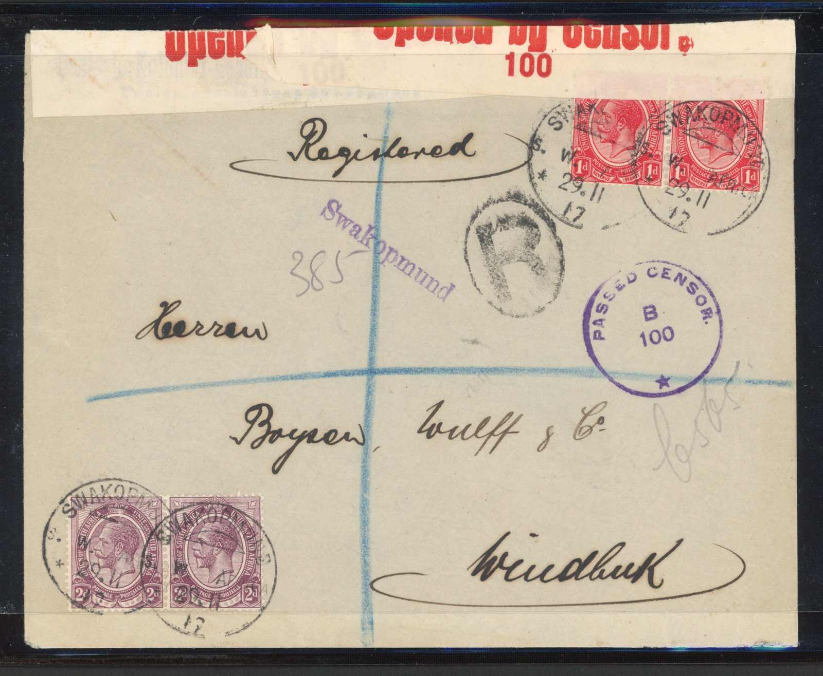 dabei vom 29.11.17 auf Inlands-R-Brief mit Zensur und Innendienststempel "Swakopmund" (1 und 2 P. je im waag. Paar), vom 23.4.18 auf frankierter Paketadresse mit 4 P. sowie vom 22.7.18 auf zensiertem Bankbrief mit 1 Sh., insgesamt gute Qualität (Image) (imagea)