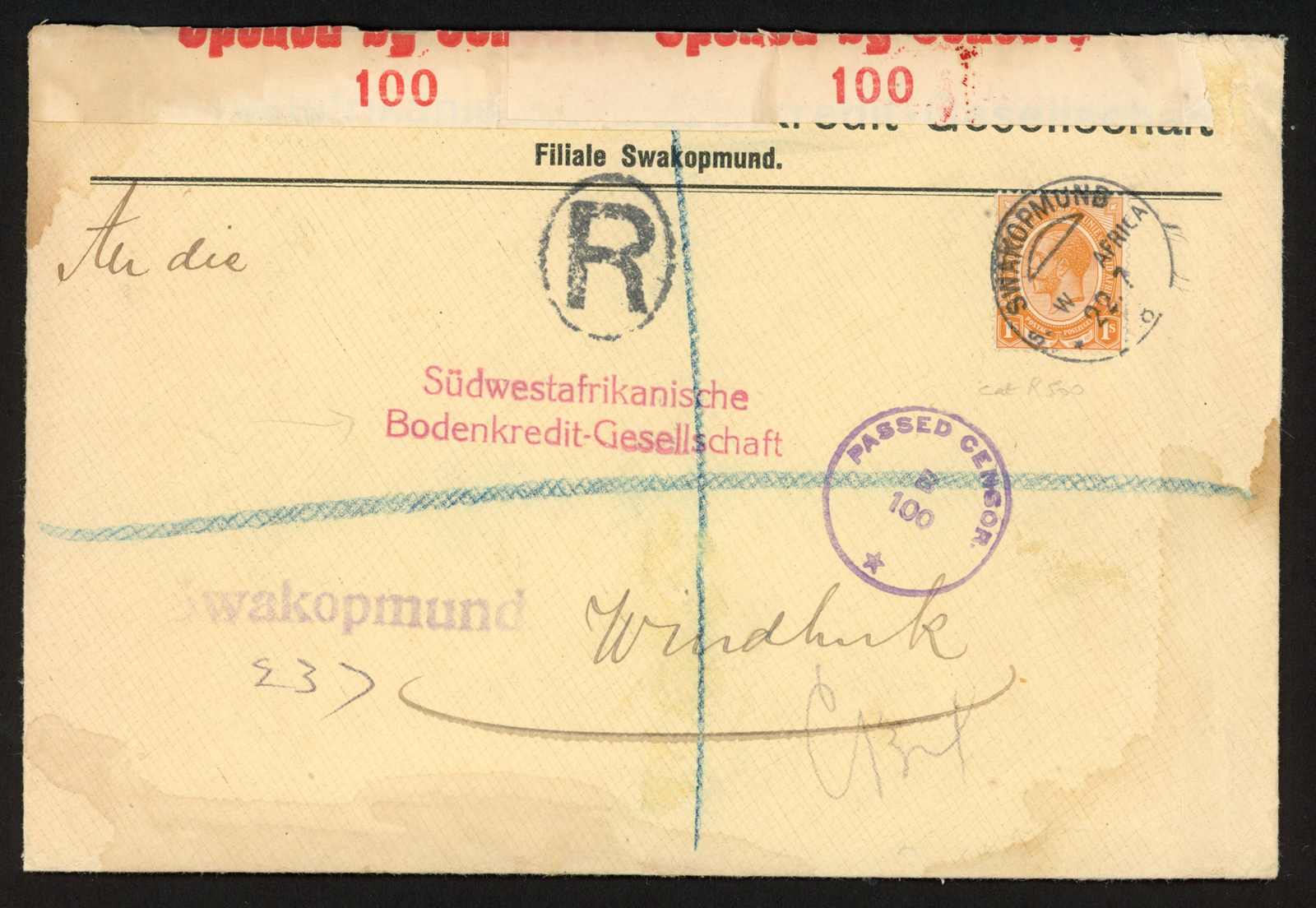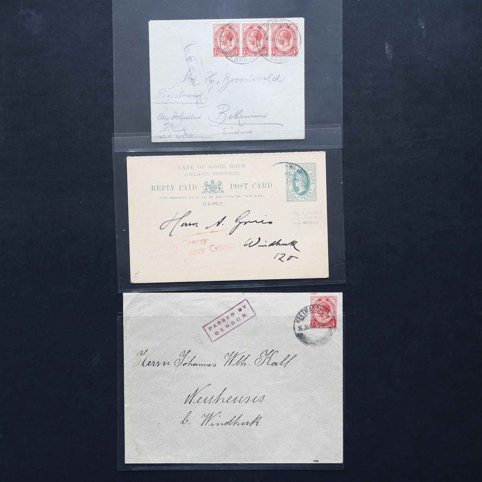 DSW MANDATSZEIT: 1915/18, drei interessante Belege mit Zensur, u.a. Ganzsache Kap der guten Hoffnung mit apt. Ovalstempel Windhoek, gute Bedarfsqualität (Image)