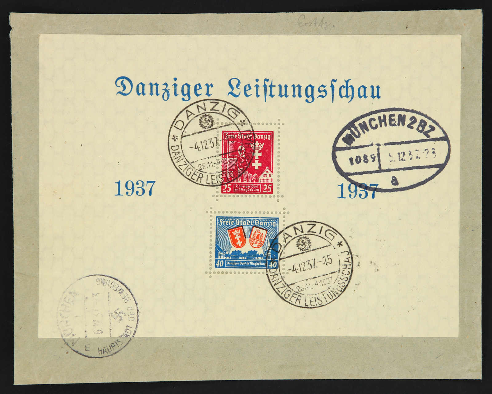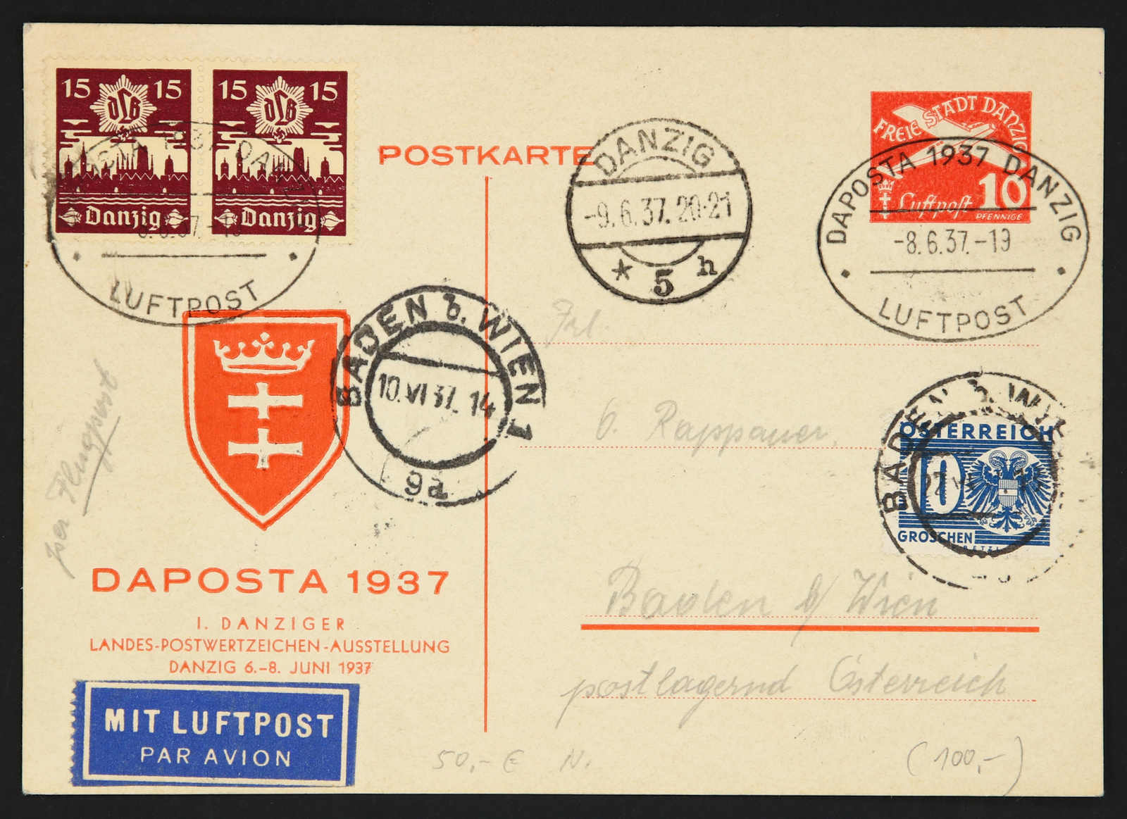 DANZIG: 1927/37, 3 Briefe bzw. Ganzsachen, dabei P 40 I mit SSt. und Bedarfstext nach Stuttgart adressiert, Privatganzsachenpostkarte der DAPOSTA 1937 zu 10 Pfg. mit Zusatzfr. Mi-Nr 268 (2) aufgegeben in Danzig und adressiert nach