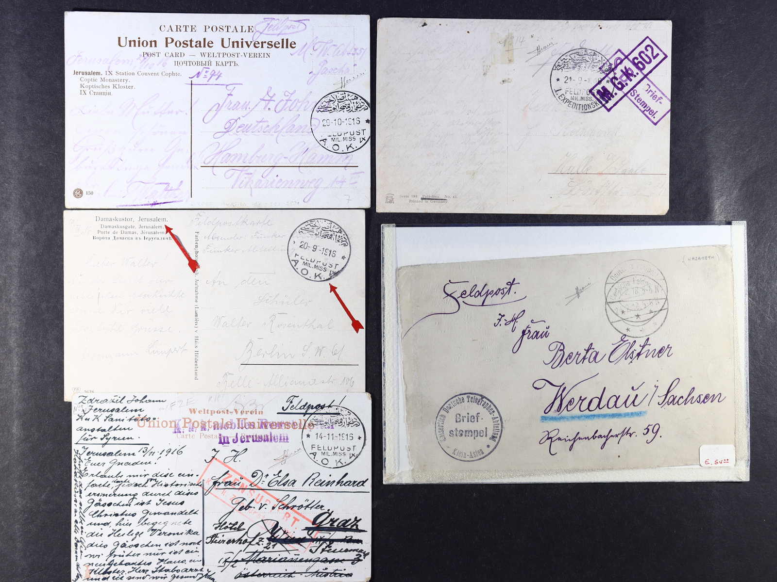 DEUTSCHE MILITÄRMISSION TÜRKEI IN PALÄSTINA: 1916/18, attraktive postgeschichtliche Zusammenstellung Belege aus Nazareth und Jerusalem nach Deutschland, gesamt fünf Belege, einer mit Attest Sorani (Image)