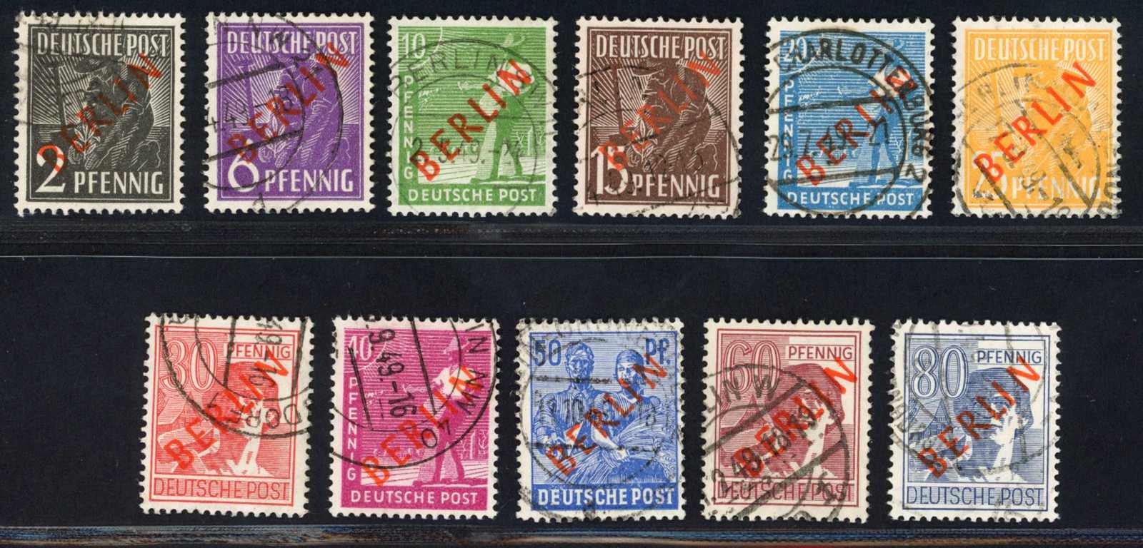 BERLIN AUFDRUCKFEHLER: 1949, 11 Werte Rotaufdruck mit dem Aufdruckfehler II "oberer E-Balken verlängert" gestempelt, dabei 2, 6, 8, 10, 15, 20, 25, 30, 40, 50, 60 und 80 Pfg., einwandfrei, 7mal geprüft Schlegel BPP (Image)