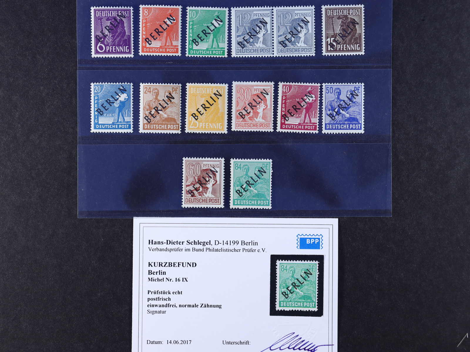 BERLIN AUFDRUCKFEHLER: 1948, 14 Werte Schwarzaufdruck mit dem Aufdruckfehler IX "unterer Bogen des B ausgebrochen" postfrisch, dabei 6, 8, 10, 12 (waag. Paar), 15, 20, 24, 30, 40, 50, 60 und 84 Pfg., einwandfrei, meist sign. und