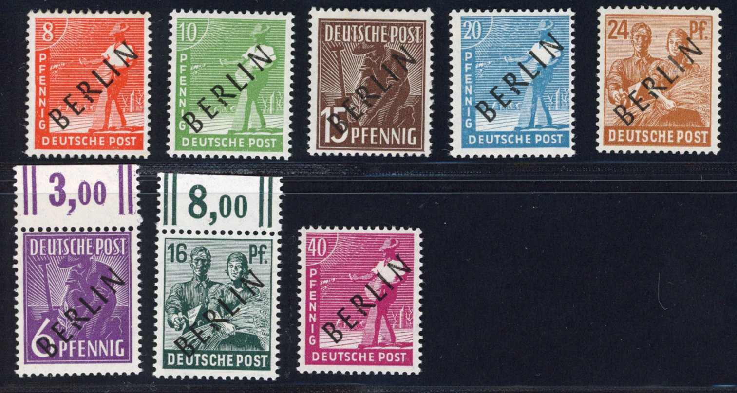 BERLIN AUFDRUCKFEHLER: 1948, 8 Werte Schwarzaufdruck mit dem Aufdruckfehler IV "R gebrochen" postfrisch, dabei 6, 8, 10, 15, 16, 20, 24 und 40 Pfg., 6 und 16 Pfg. vom durchgezähnten Walzenoberrand, einwandfrei, meist sign. und für