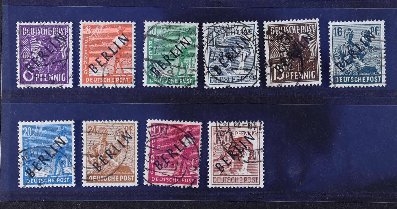 BERLIN: 1948/90, gestempelte Sammlung im E.-Buch, in den Hauptnummern fast komplett, es fehlt 20 Pfg. Währungsgeschädigte, die Markwerte Schwarzaufdruck mit falschen Stempeln, Block 1 echt und einwandfrei, im Anhang einige moderne