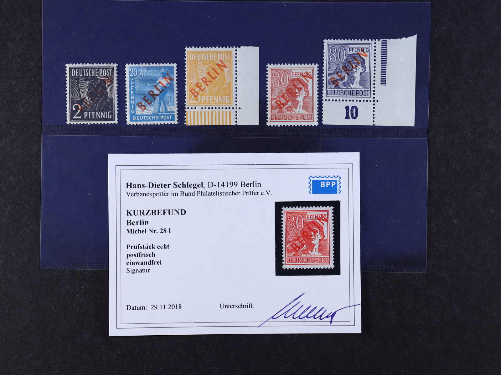 BERLIN AUFDRUCKFEHLER: 1949, 5 Werte Rotaufdruck mit dem Aufdruckfehler I "L mit Apostroph" postfrisch, dabei 2, 20, 25, 30 und 80 Pfg., 25 und 80 Pfg. sind aus der rechten unteren Bogenecke, 2 Pfg. etwas unregelmäßige Zähnung und