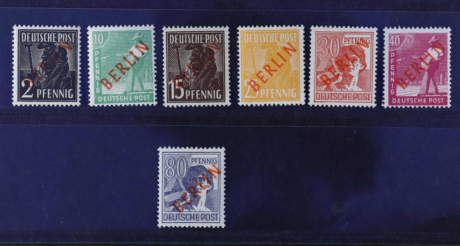 BERLIN AUFDRUCKFEHLER: 1949, 7 Werte Rotaufdruck mit dem Aufdruckfehler II "oberer E-Balken verlängert" postfrisch, dabei 2, 10, 15, 25, 30, 40 und 80 Pfg., einwandfrei, geprüft Schlegel BPP (Image)