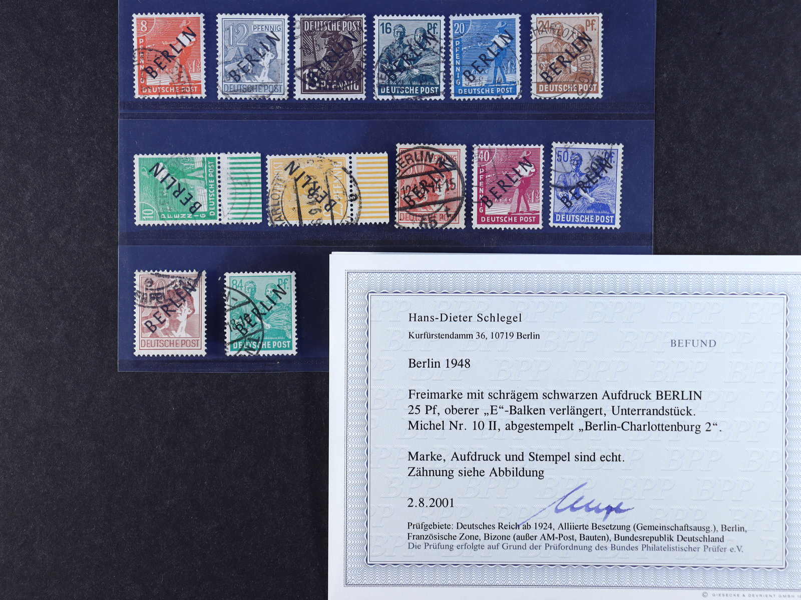 BERLIN AUFDRUCKFEHLER: 1948, 10 Werte Schwarzaufdruck mit dem Aufdruckfehler IX "unterer Bogen des B ausgebrochen" gestempelt, dabei 6, 8, 10, 12, 15, 16, 20, 24, 40 und 60 Pfg., einwandfrei, bis auf 16 Pfg. geprüft Schlegel BPP (Image)