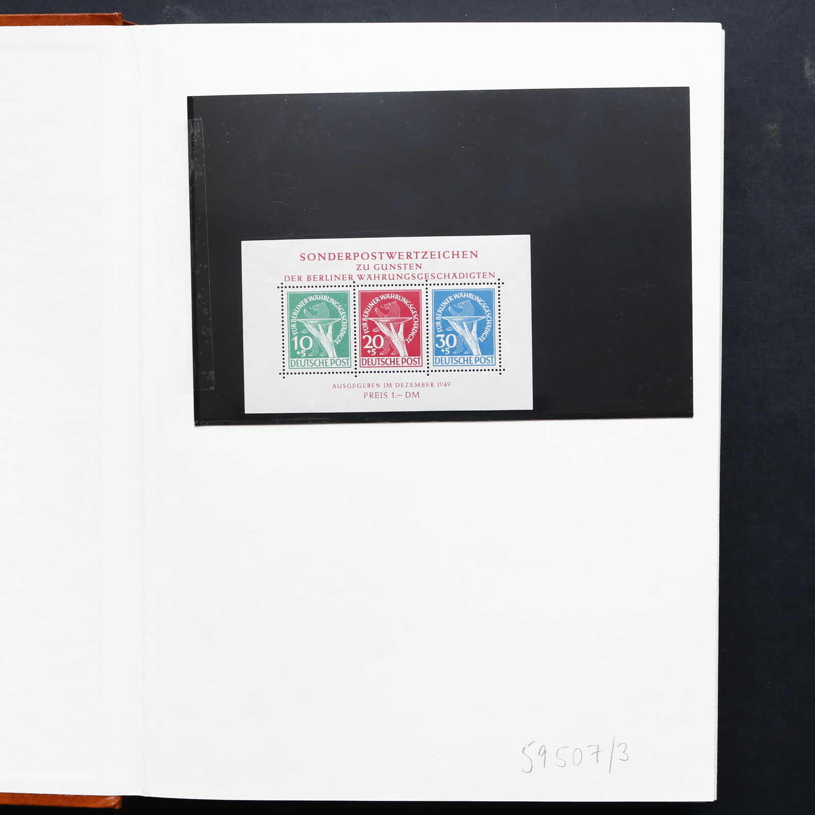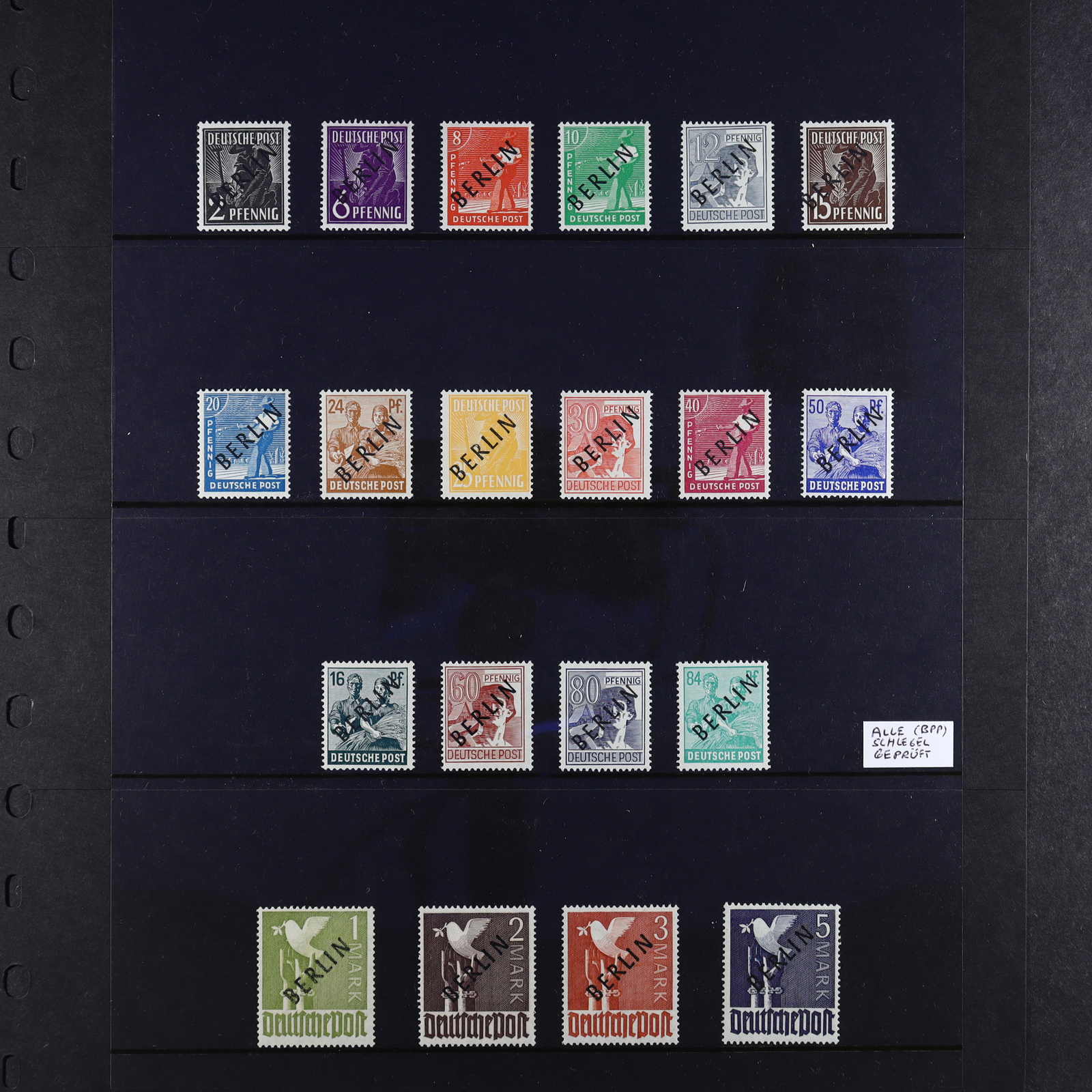 BERLIN: 1948/90, meist postfrische Sammlung inkl. Zusammendrucke in 2 Lindner-Alben, nicht komplett, insbesondere ohne 1 und 2 DM Rotaufdruck, Mi-Nr. 1-20 postfrisch sign. Schlegel BPP, Bl. 1 mit gummimatter Stelle im Rand, Marken