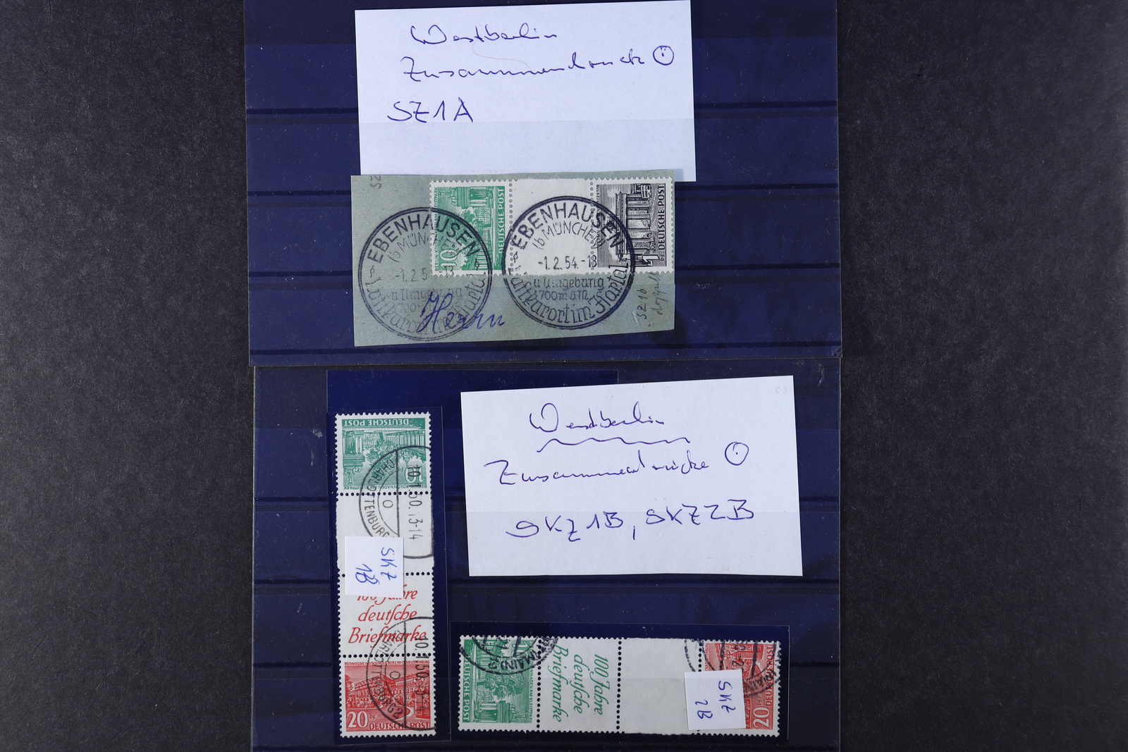 BERLIN ZUSAMMENDRUCKE: 1949/52, Zusammenstellung von Zusammendrucken aus den Markenheftchen 1 und 2 gestempelt oder auf Briefstück, dabei bessere wie W 4, W 12, W 14, SZ 1 A, SKZ 1 B und 2 B, W 31 sowie SZ 5, meist einwandfrei,