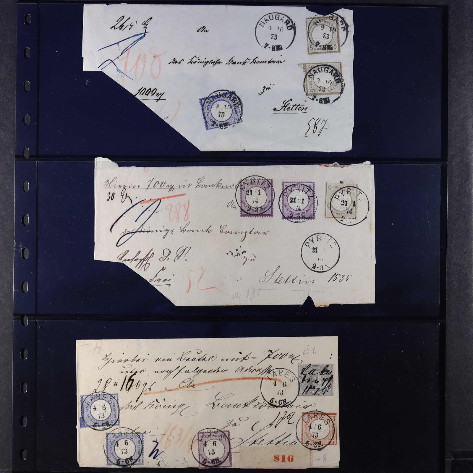 3515 Briefst., Brief imageNORDDEUTSCHER BUND/DEUTSCHES REICH BRUSTSCHILD: 1870/74, 10 Mischfrankaturen NDP und/oder Brustschild nach Stettin, meist mit Aktenschnitt und verkürzt, Marken farbfrisch mit sauberen Stempeln und überwiegend einwandfrei, u.a. NDP Mi-Nr. 25 (2) und 26 (4) sowie Deutsches Reich 1 und 6 (je 3mal tadellos) und 12 (2), optisch beeindruckendes und werthaltiges Lot, Katalogwert allein für die Marken schon über 3.000 Euro (Image) (imagea) (imageb) (imagec)