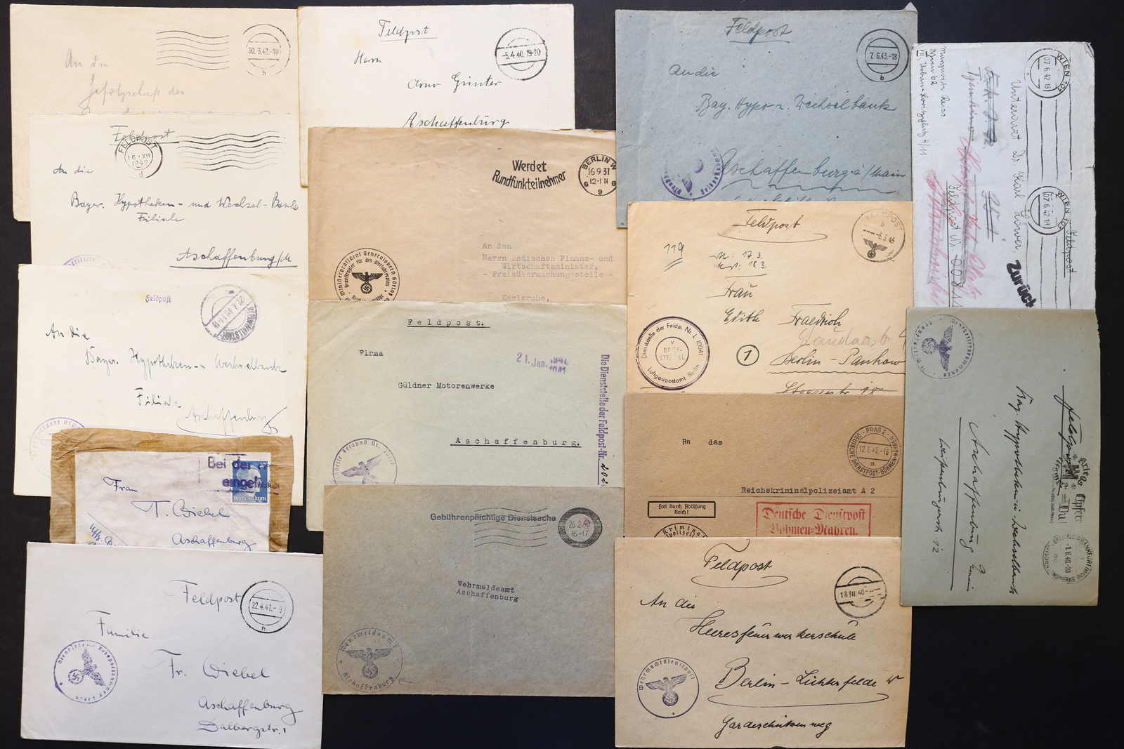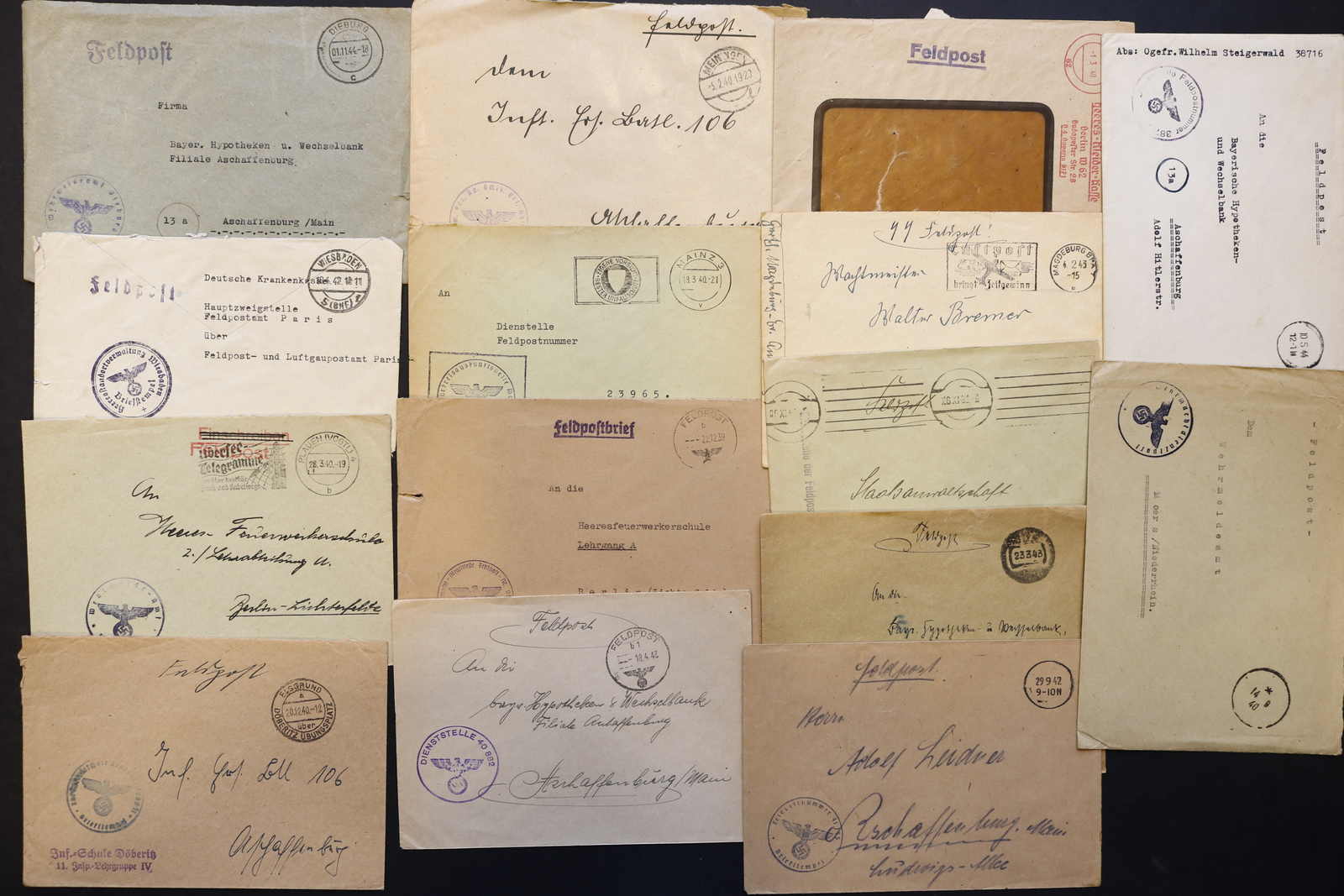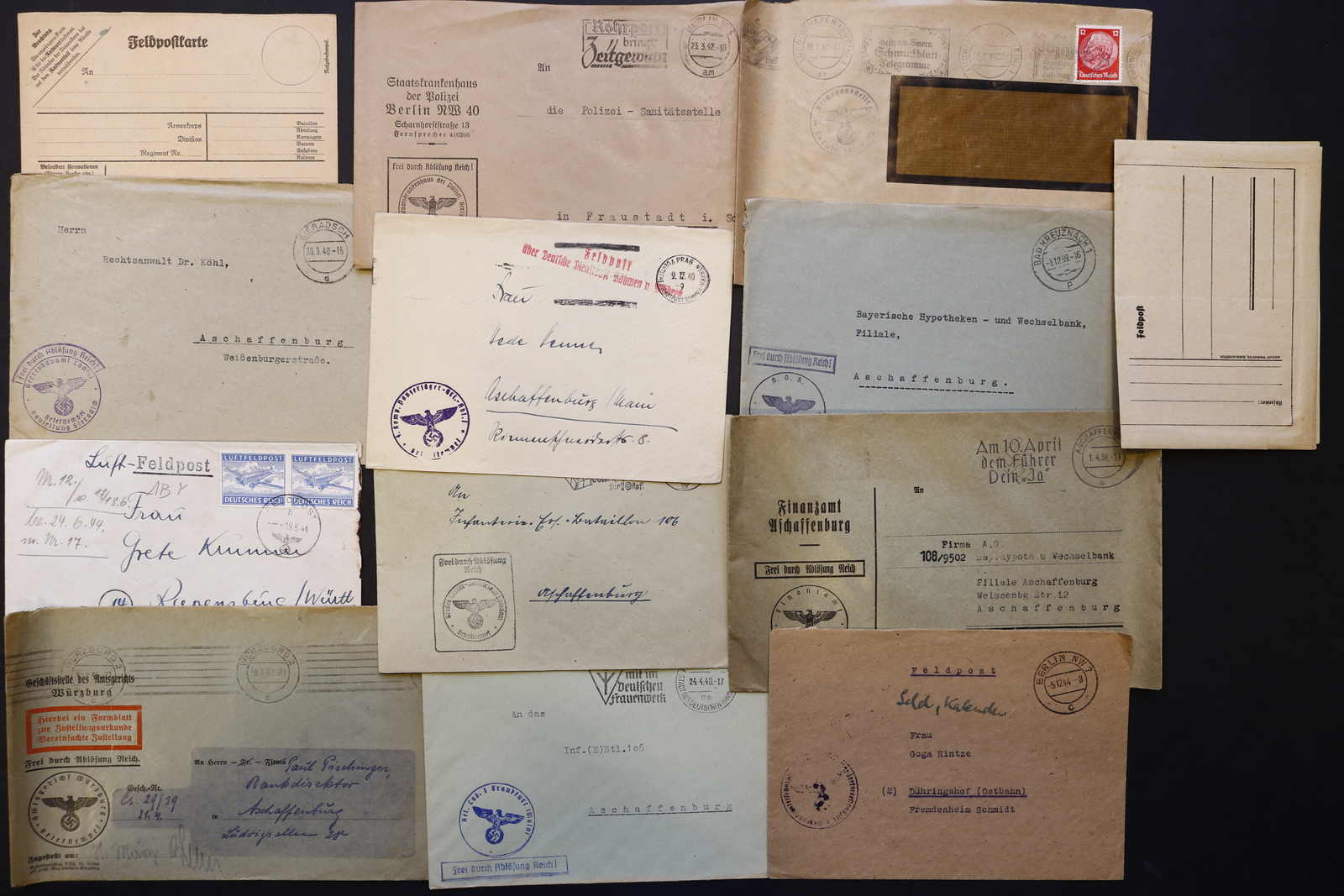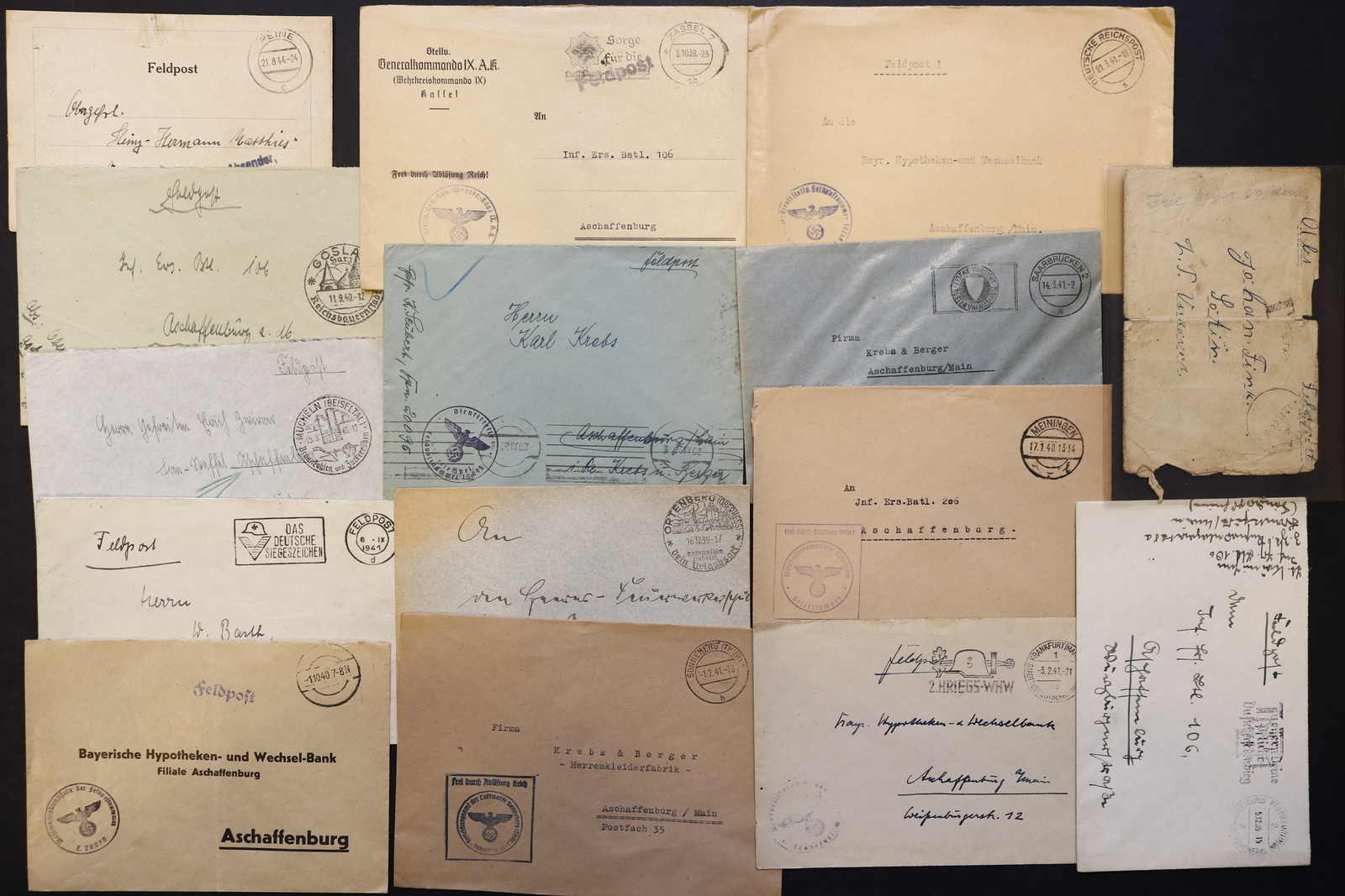 3522 Brief imageDEUTSCHLAND: 1840/1944 ca., Karton mit über 200 Briefen und Karten ab Vorphila, meist Feldpost II. Weltkrieg, dabei viele stumme oder aptierte Stempel, Päckchenadresse mit 20 Pfg.-Porto, Kriegsgefangenenpost und Postkarte Festung Nazaire vom 15.10.1944 (gelocht), interessante Mischung, etwas unterschiedliche Qualität (Image) (imagea) (imageb) (imagec) (imaged) (imagee) (imagef) (imageg) (imageh) (imagei) (imagej) (imagek) (imagel) (imagem)