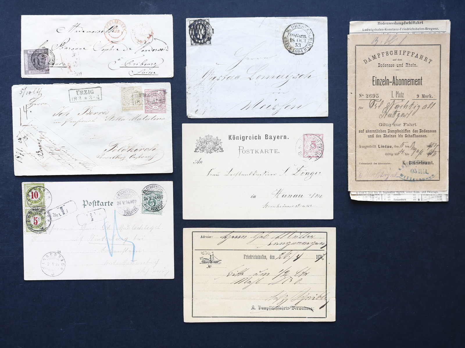 3528 Brief imageALTDEUTSCHLAND: 1853/86, kl. Posten Briefe und Postkarten, dabei bessere Frankaturen, u.a. Baden Mi-Nr. 4 als EF a. Brief in die Schweiz, Sachsen Mi-Nr. 3 auf Bahnpostbrief aus Dresden nach Meißen und NDP GA U 1 A mit Zusatzfr. Mi-Nr. 6 als Wertbrief aus Ürzig nach Feldkirch/Österreich, dazu eine PK Bayern mit priv. Zudruck und ein Einzel-Abonnement der Dampfschifffahrt auf dem Bodensee, interessante Mischung, überwiegend gute Qualität (Image)