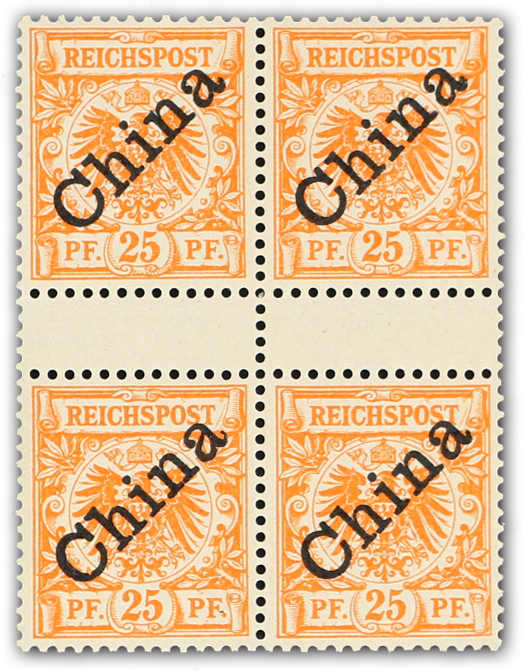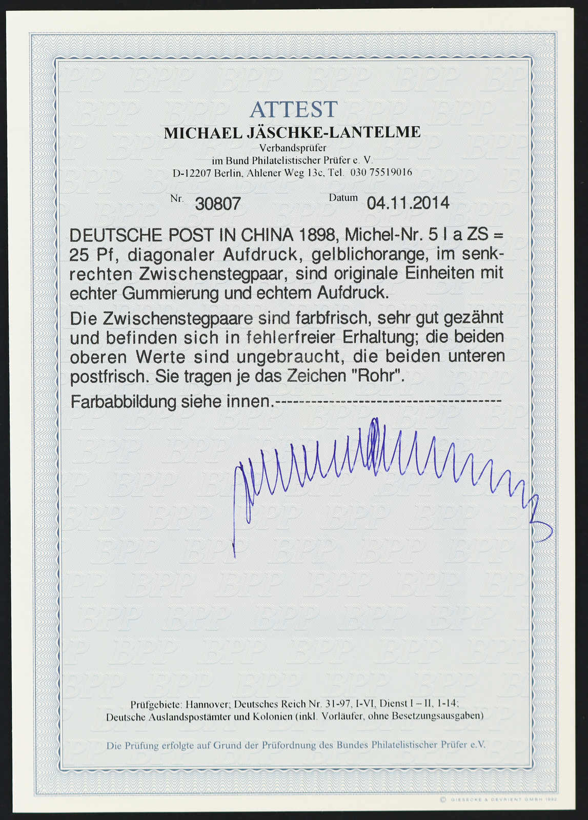 1898, 25 Pfg. diagonaler Aufdruck gelblichorange, senkrechtes Zwischenstegpaar im Viererblock von zwei Paaren, die beiden oberen Werte ungebraucht, die unteren beiden postfrisch, einwandfrei, signiert Rohr, Fotoattest Jäschke-Lantelme BPP