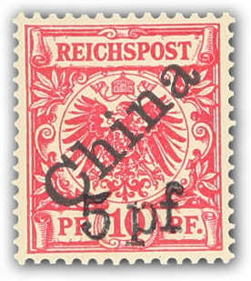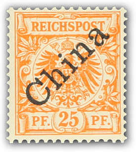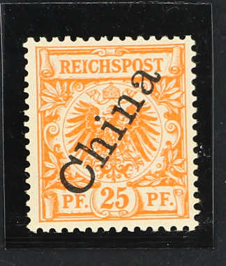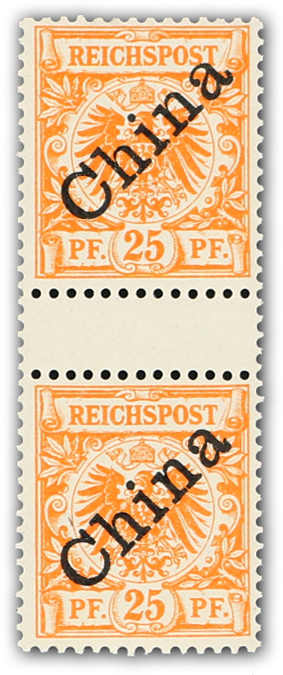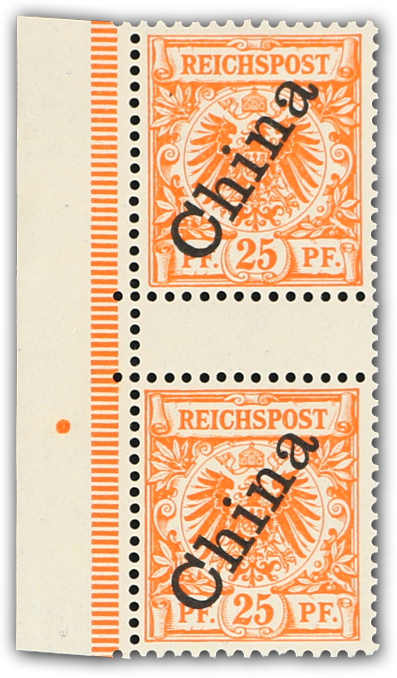 1898, 25 Pfg. dunkelorange mit steilem Aufdruck "CHINA", postfrisches Zwischenstegpaar vom linken Bogenrand, farfrisch und gut gezähnt, einwandfrei (ME 400,-) (Image)