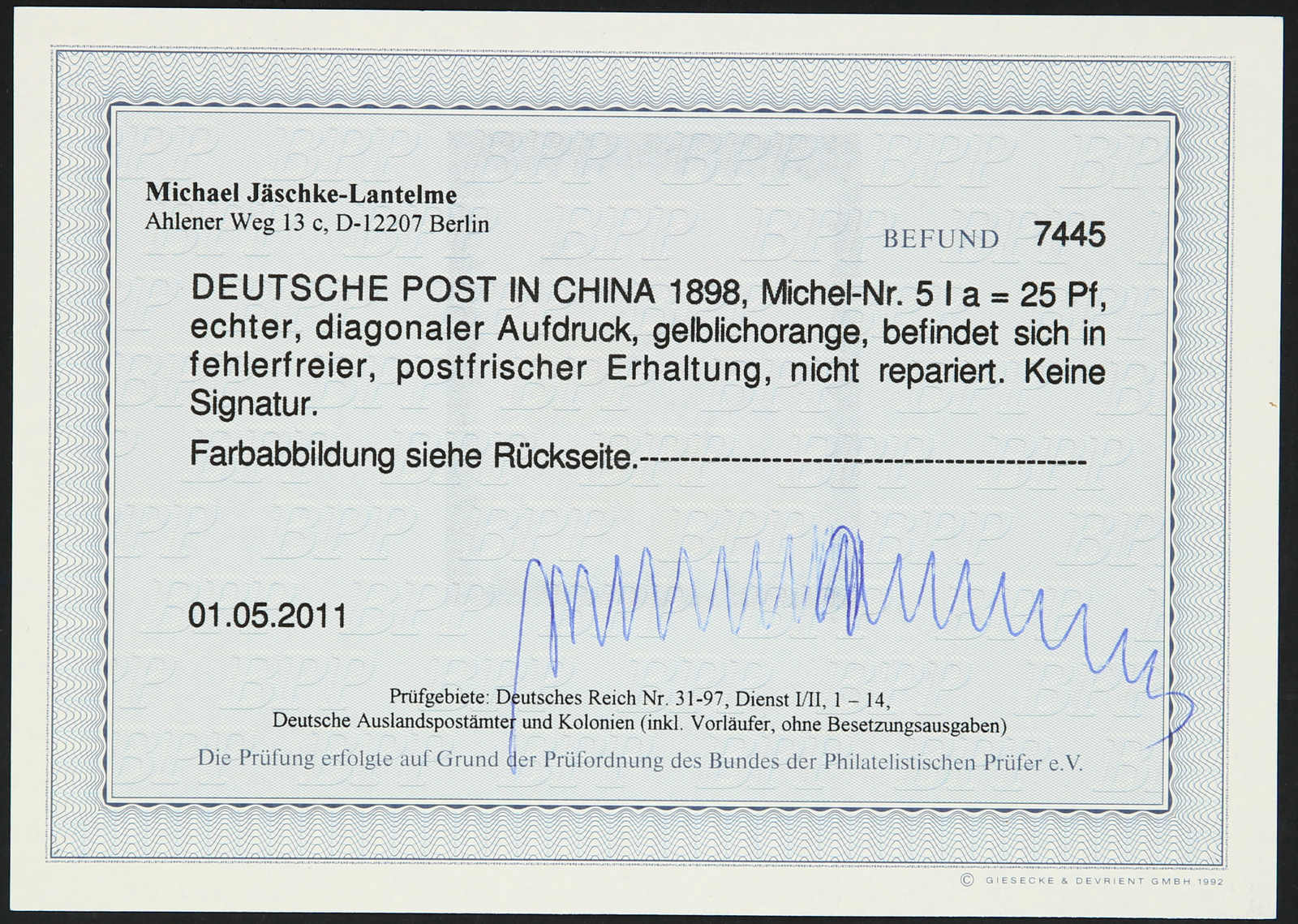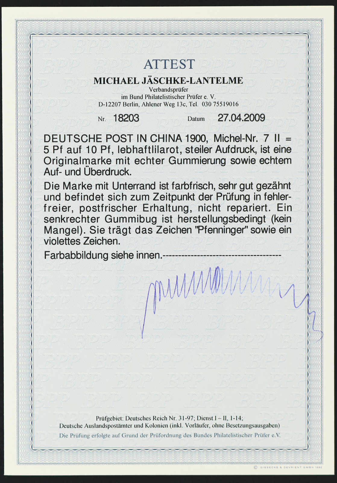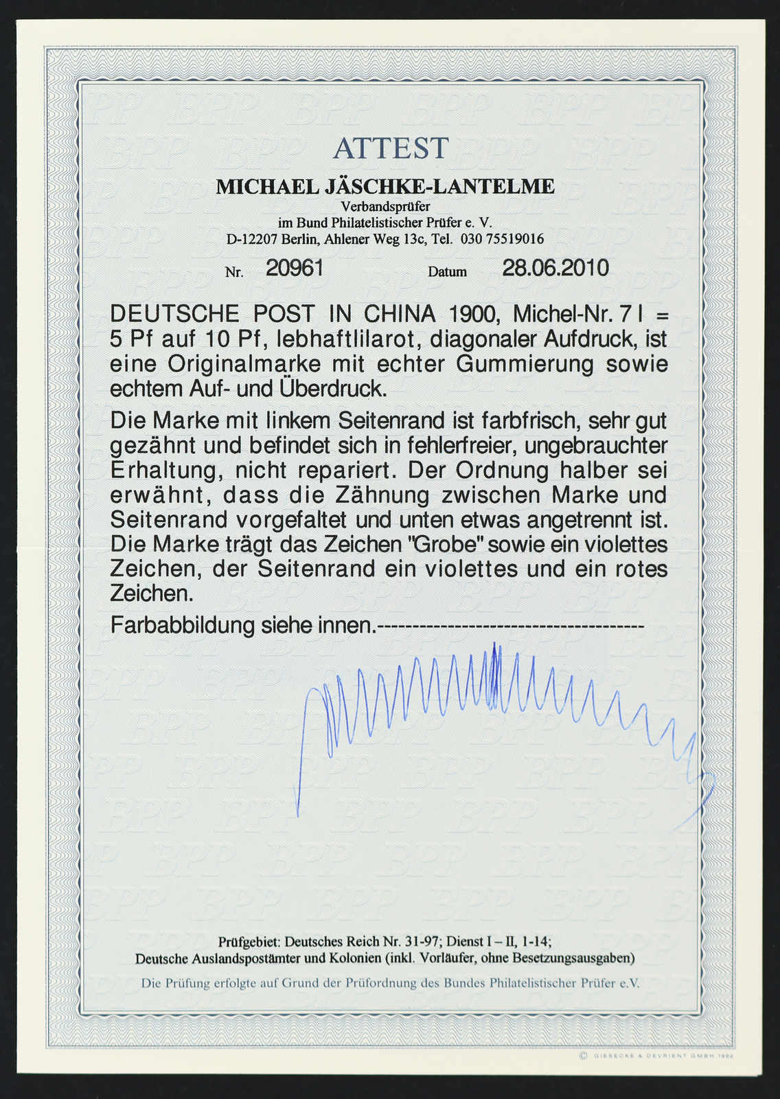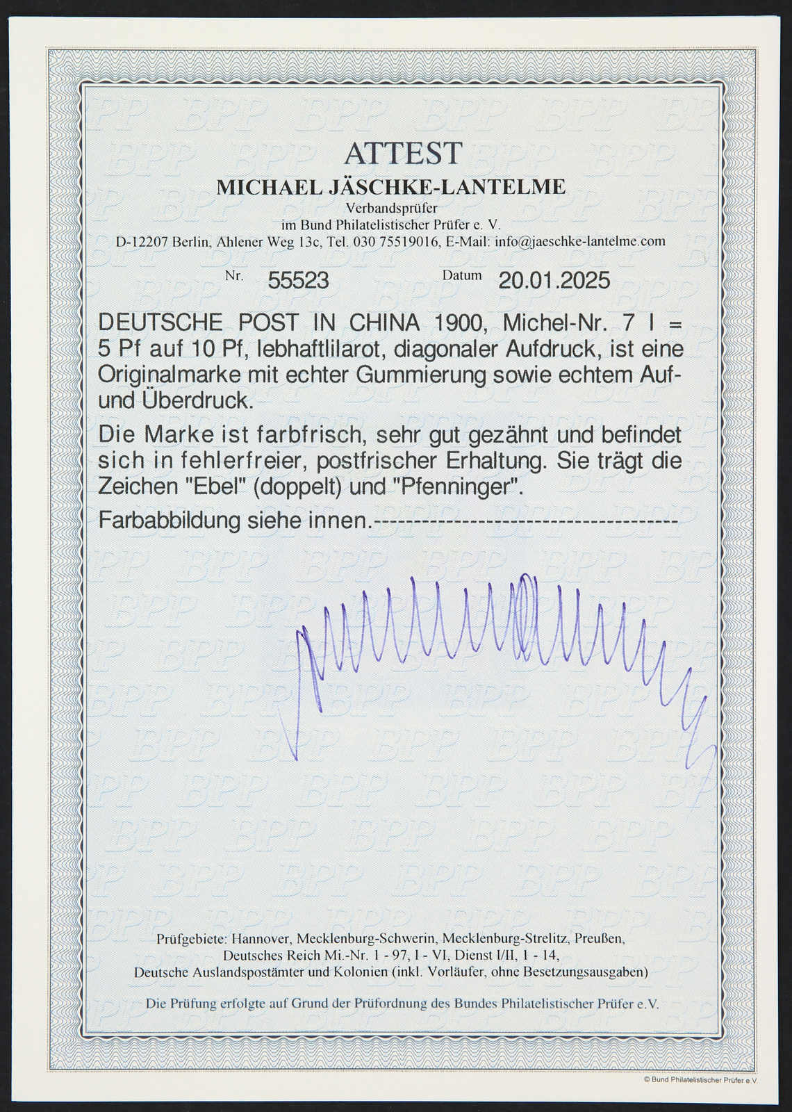 1900, 5 pf auf 10 Pfg. diagonaler Aufdruck lebhaftlilarot, postfrisch, einwandfrei, signiert, Fotoattest Jäschke-Lantelme BPP 01/2025 (ME 1.800,-)