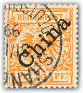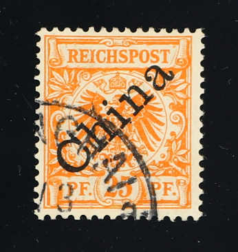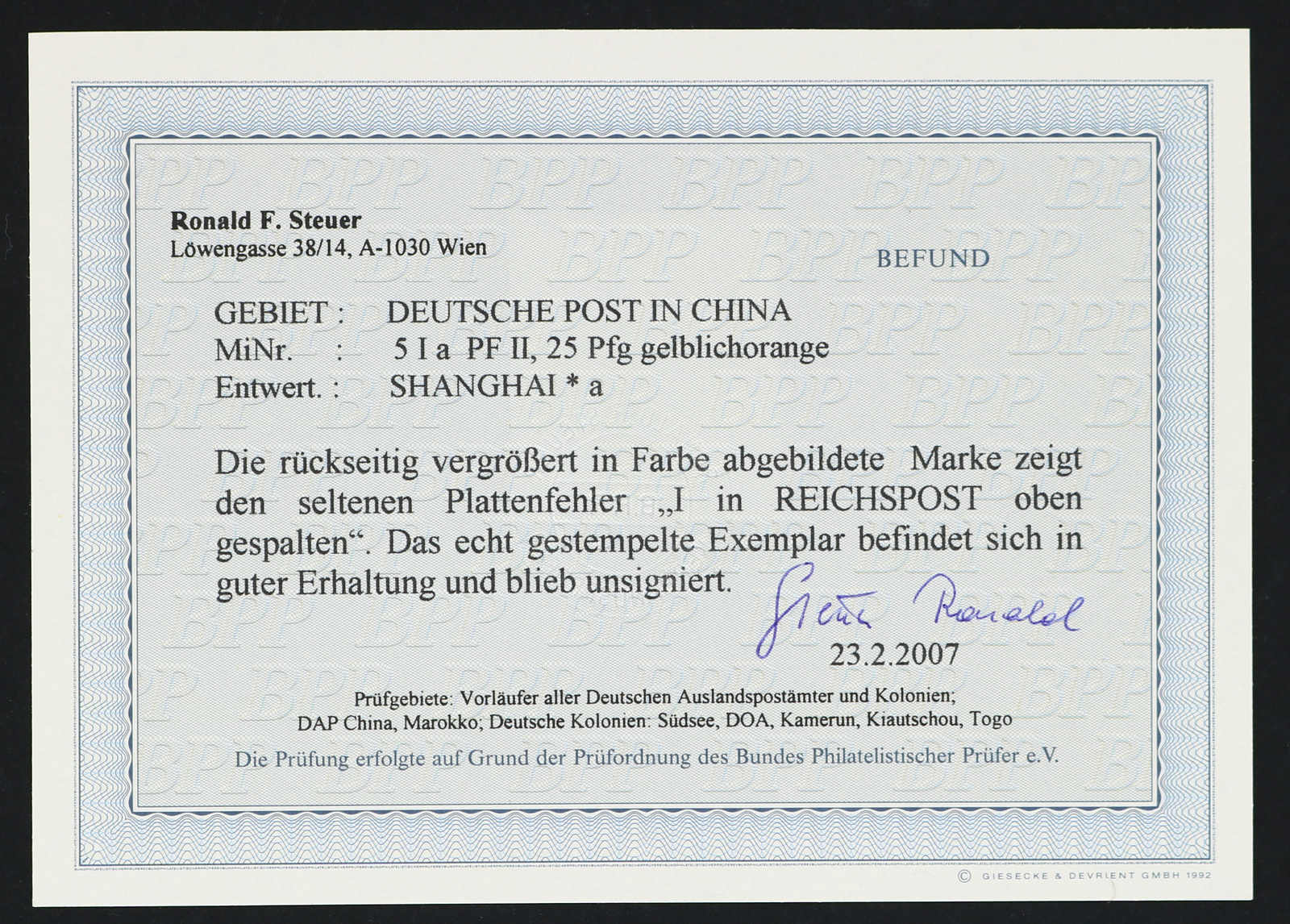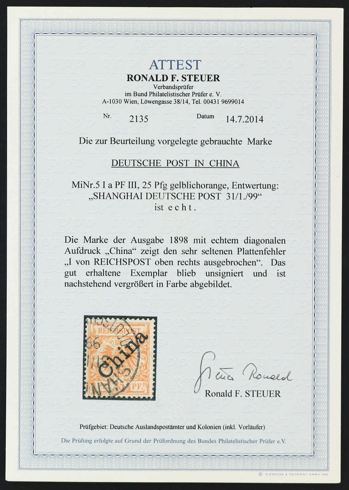 1898, 25 Pfg diagonaler Aufdruck gelblichorange, mit Plattenfehler "I von REICHSPOST oben rechts ausgebrochen", sauber gestempelt "SHAN(GHAI) 31/1 99", einwandfrei, Fotoattest Steuer BPP (ME 800,-) (Image) (imagea)