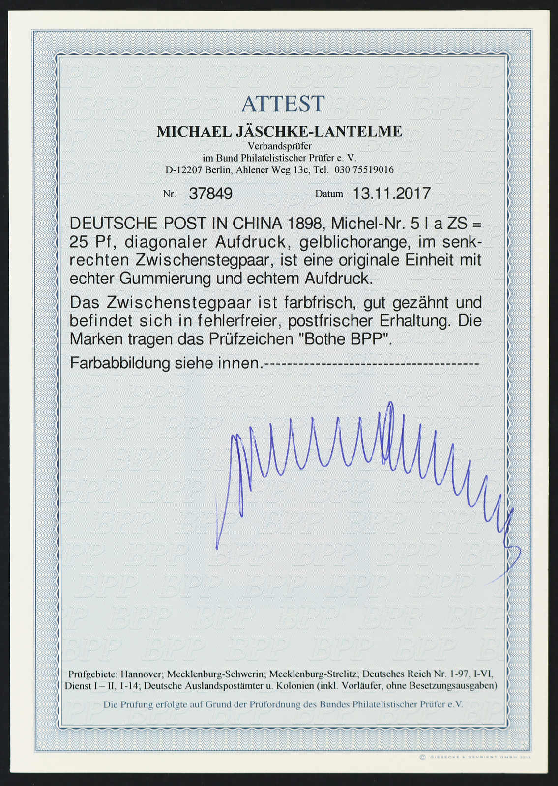 1898, 25 Pfg. diagonaler Aufdruck gelblichorange, senkrechtes Zwischenstegpaar postfrisch in einwandfreier Qualität, geprüft Bothe BPP, Fotoattest Jäschke-Lantelme BPP (ME 800,-) (Image) (imagea)