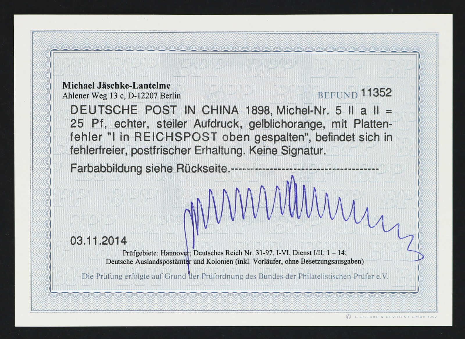 1898, 25 Pfg. steiler Aufdruck gelblichorange, mit Plattenfehler "I in REICHSPOST oben gespalten", postfrisch, einwandfrei, unsigniert, Fotobefund Jäschke-Lantelme BPP (ME 450,-) (Image) (imagea)
