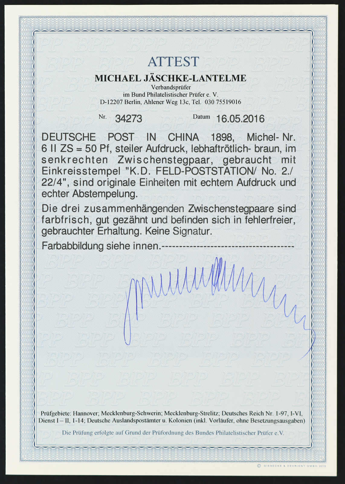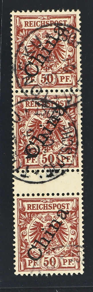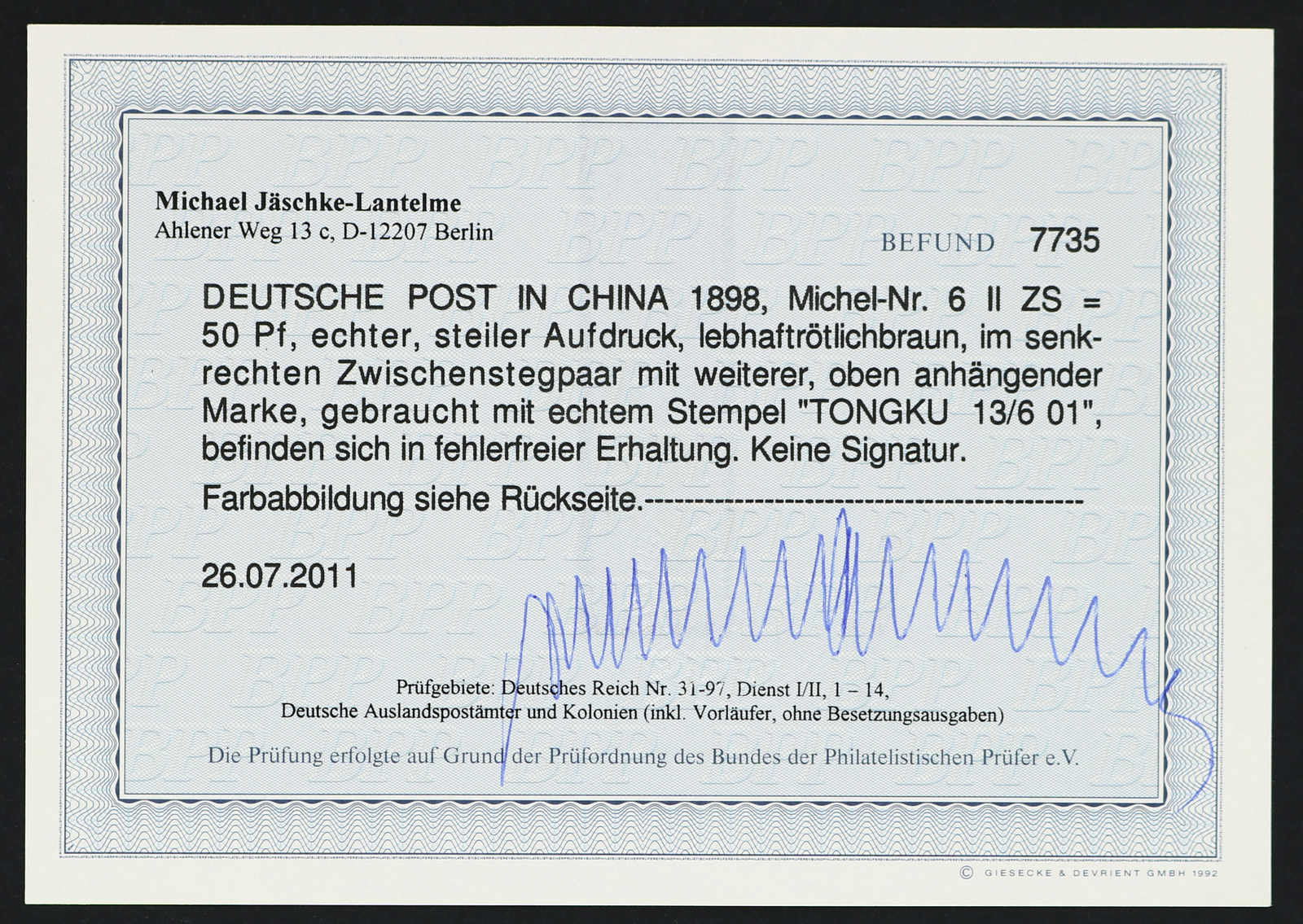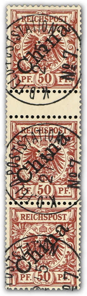 1898, 50 Pfg. steiler Aufdruck lebhaftrötlichbraun im Zwischenstegpaar mit weiterer oben anhängender Marke, gestempelt "TONGKU 13/6 01", einwandfrei, Fotobefund Jäschke-Lantelme BPP (ME 300,-+) (Image) (imagea)