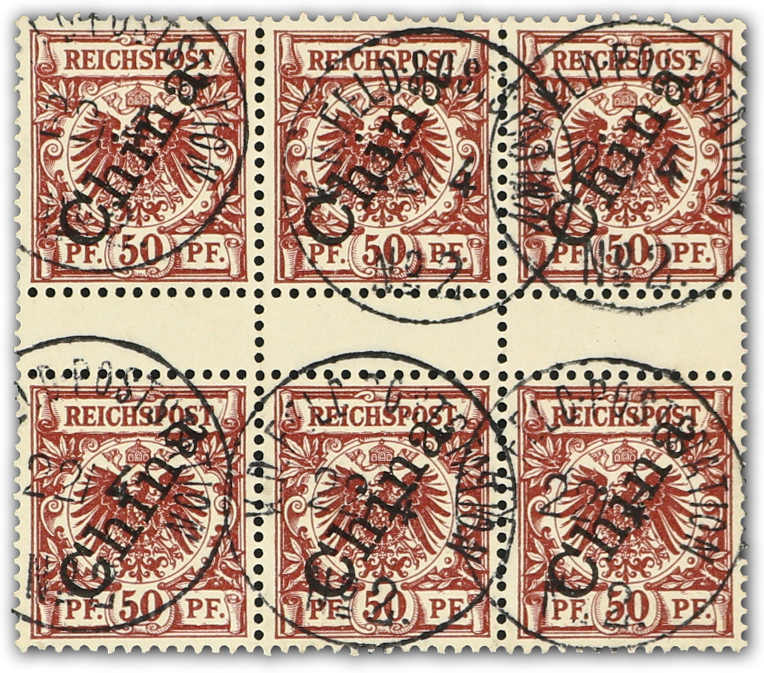 1898, 50 Pfg. steiler Aufdruck lebhaftrötlichbraun, senkrechtes Zwischenstegpaar im Sechserblock von drei Paaren, sauber gestempelt mit sechs klaren Abschlägen "K.D. FELD-POSTSTATION No. 2 22/4", farbfrisch und einwandfrei, Fotoattest