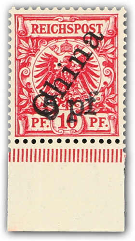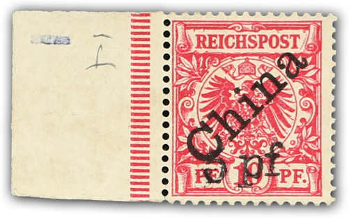 1900, 5 pf auf 10 Pfg. lebhaftlilarot, diagonaler Aufdruck, ungebrauchtes Exemplar vom linken Bogenrand, Zähnung vorgefaltet und angetrennt, farbfrisch, einwandfrei, signiert, Fotoattest Jäschke-Lantelme BPP (ME 800,-) (Image) (imagea)