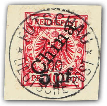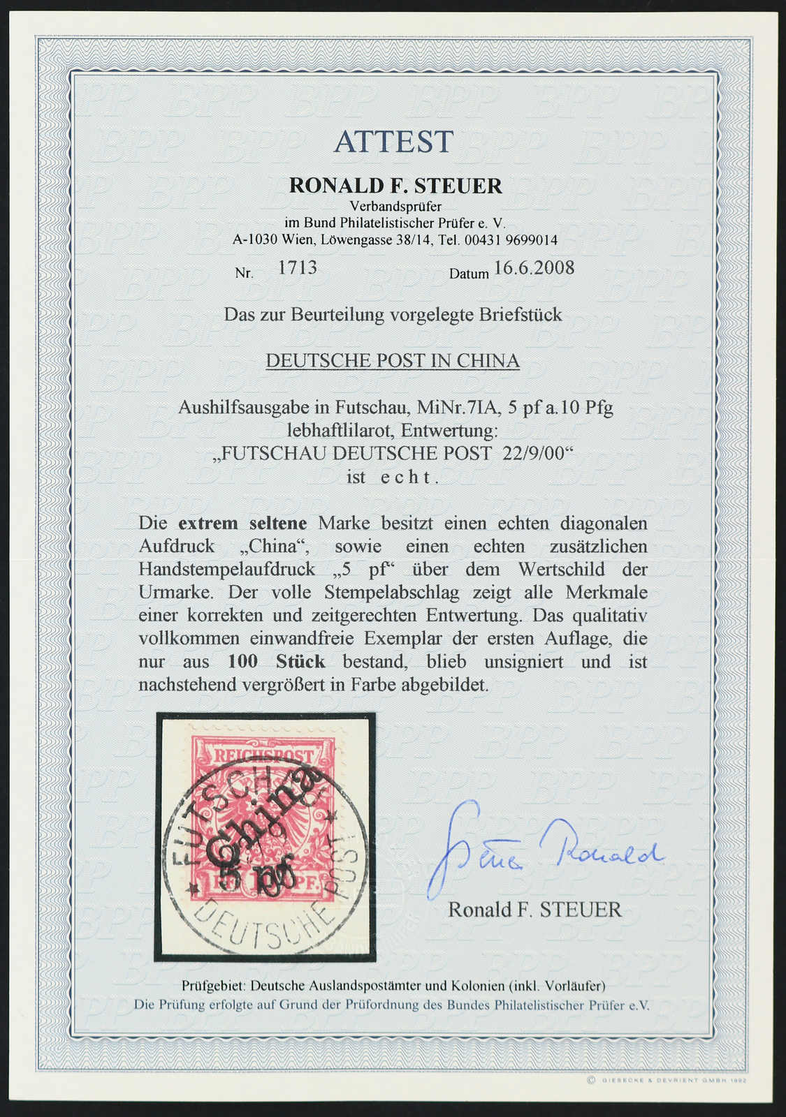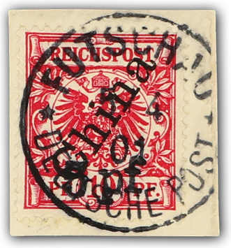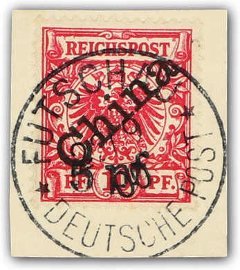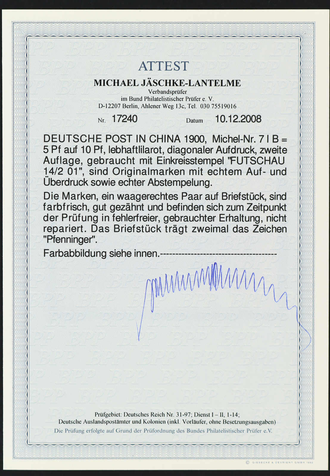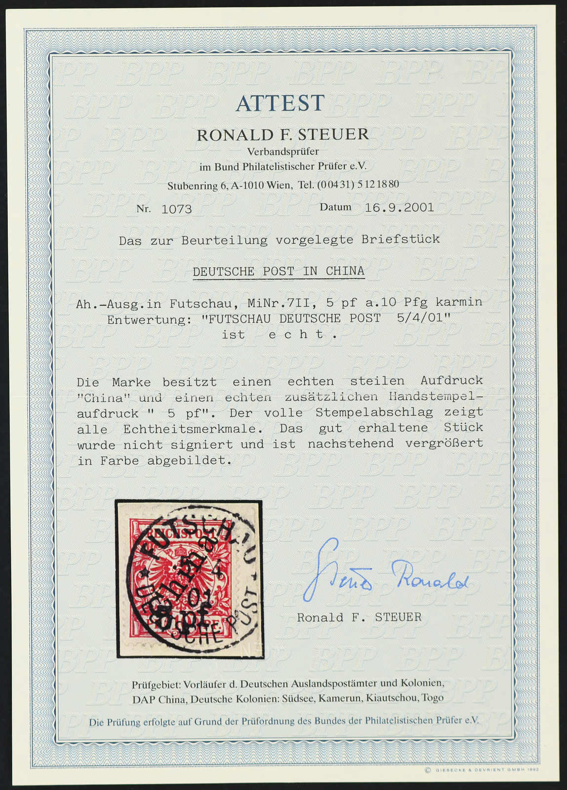 1900, 5 pf auf 10 Pfg. karmin, steiler Aufdruck, klar gestempelt "FUTSCHAU 5/4 01" auf Briefstück, einwandfrei, Fotoattest Steuer BPP (ME 1.000,-)