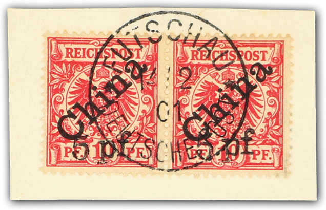 1900, 5 pf auf 10 Pfg. lebhaftlilarot, diagonaler Aufdruck, 2. Auflage, waagerechtes Paar auf Briefstück mit klarer zentrischer Entwertung "FUTSCHAU 14/2 01", einwandfrei, signiert Pfenninger, Fotoattest Jäschke-Lantelme BPP (ME 2.400,-