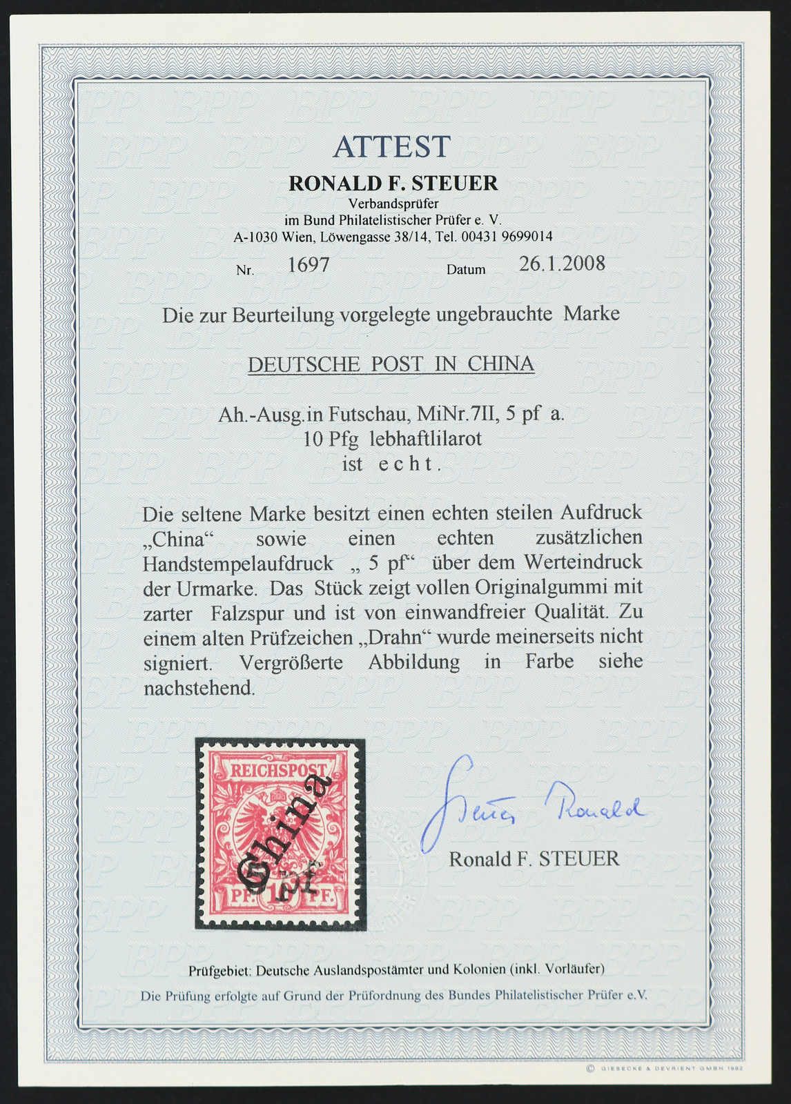 1900, 5 pf auf 10 Pfg. lebhaftlilarot, steiler Aufdruck, ungebraucht, einwandfrei, signiert Drahn, Fotoattest Steuer BPP (ME 700,-) (Image) (imagea)