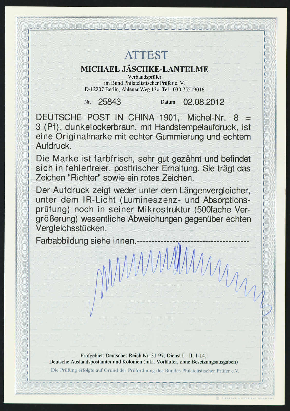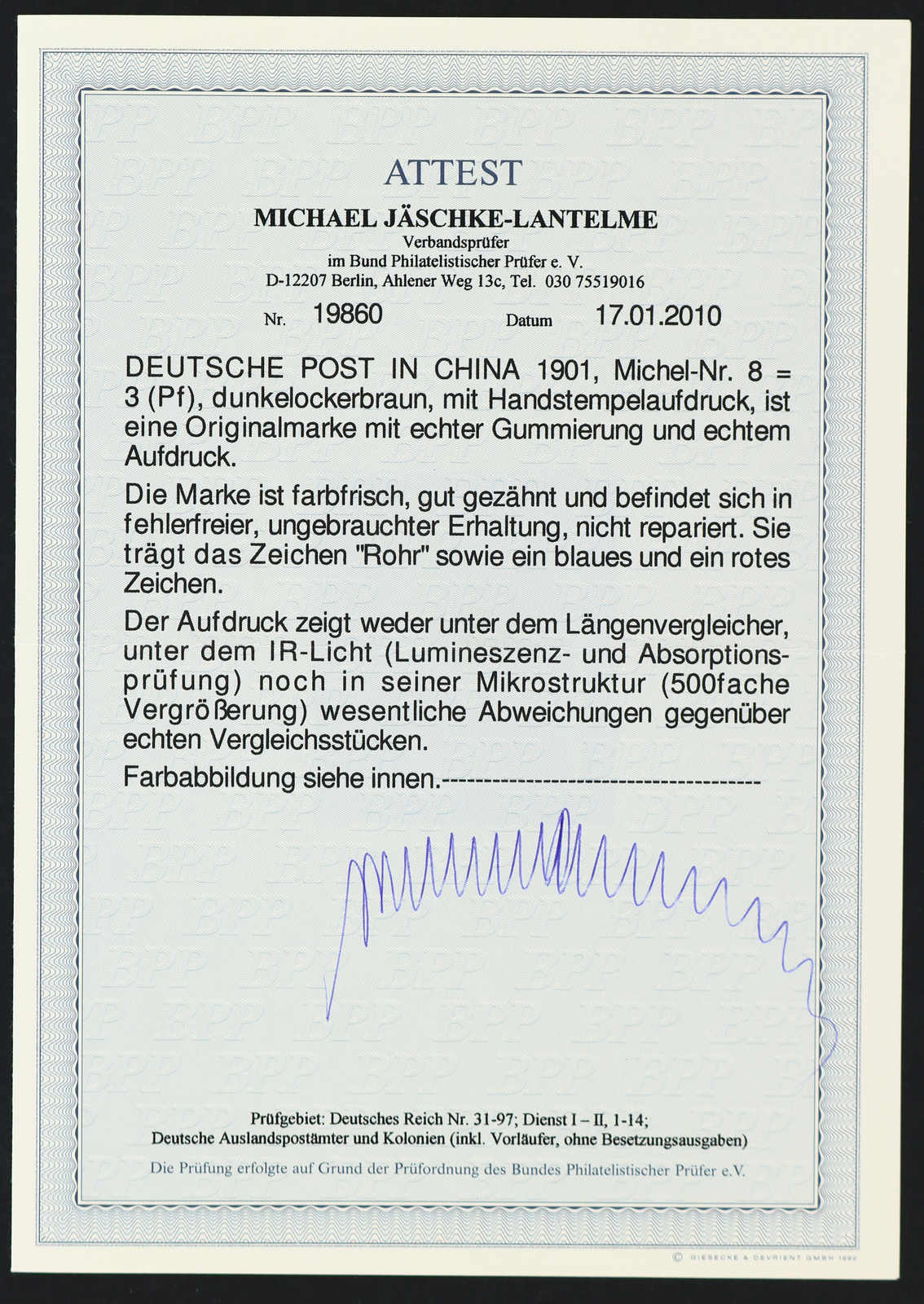 1901, 3 Pfg. dunkelockerbraun mit Handstempelaufdruck, ungebraucht, farbfrisch und einwandfrei, signiert, Fotoattest Jäschke-Lantelme BPP (ME 750,-)