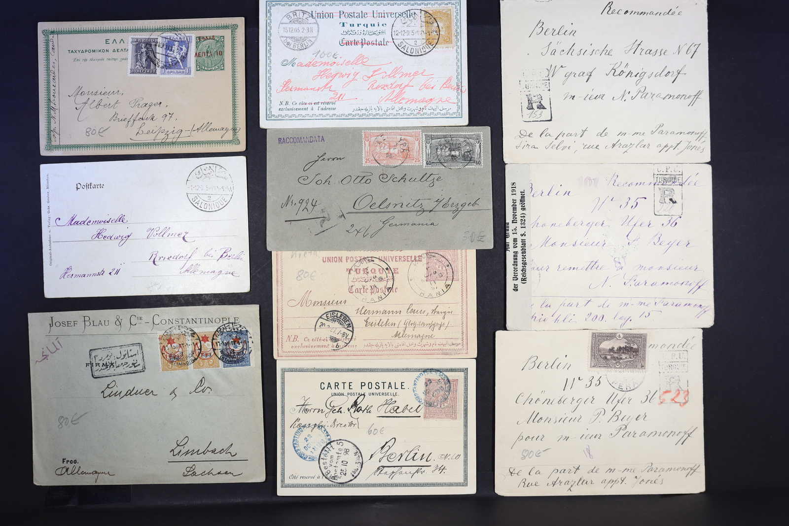 Zusatzfr. nach Leipzig, dazu 6 Belege der Türkei, hierbei 3 Einschreibbriefe aus Anfang der 20er-Jahre nach Berlin und eine frühe Ganzsache der Post a. Kreta, aufgegeben "HANIA", nach Eisleben, ges. 10 Belege, überwiegend gute Qualität, bitte
