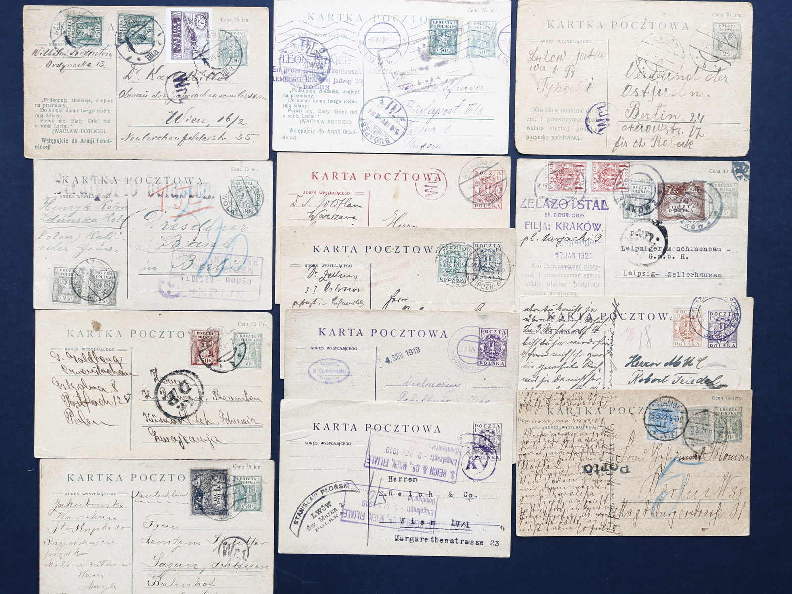 POLEN: 1919/52, kl. Posten gebrauchter Ganzsachen-Postkarten aus P 23 bis P 149, dabei viele frühe Karten mit Zusatzfrankatur, teils ins Ausland adressiert und teils mit Nachporto, dazu P 106 und P 124 mehrfach mit verschiedenen