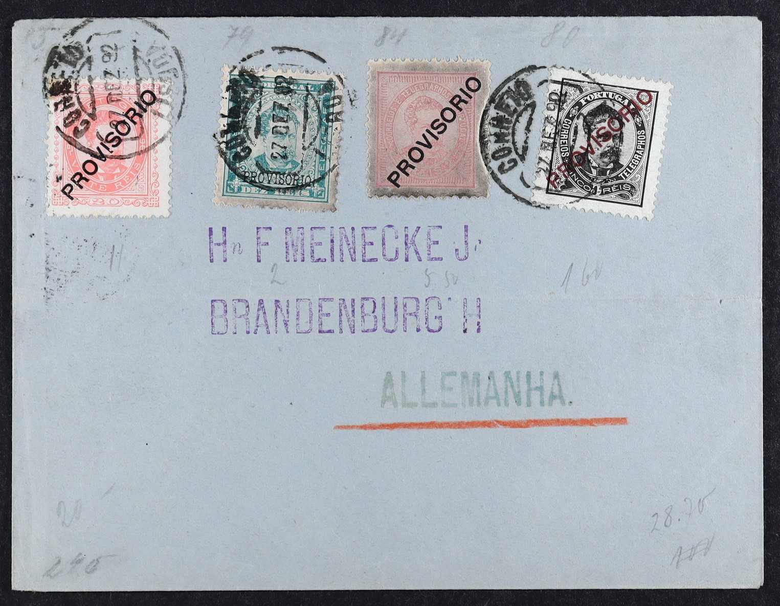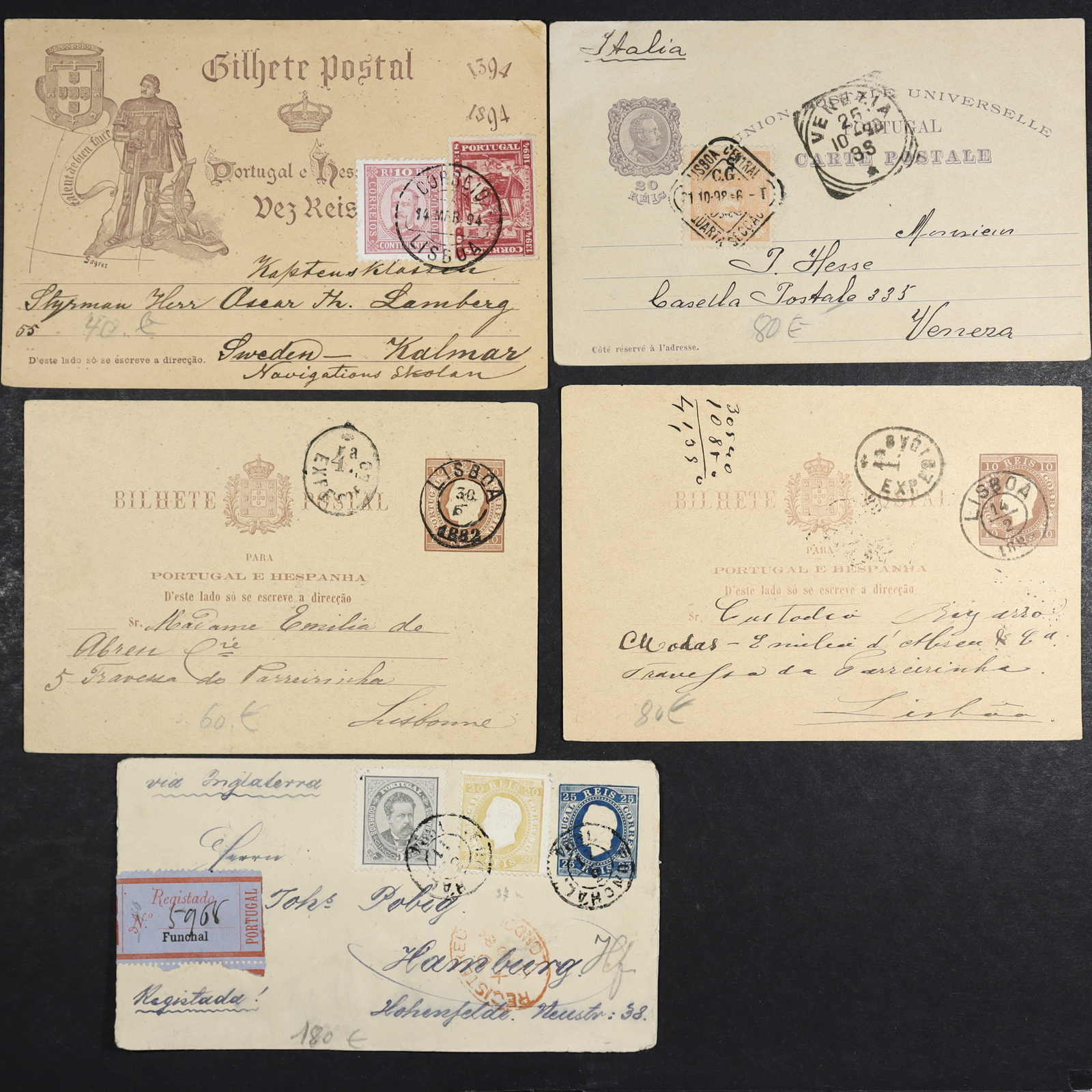 PORTUGAL: 1884/94, kl. Briefeposten, dabei ein U 1A mit Zusatzfrankatur als Einschreiben, aufgegeben "FUNCHAL 3.11.1884", über London nach Hamburg befördert, dazu 4 Postkarten, teils Ganzsachen, zum Teil als Auslandspost nach