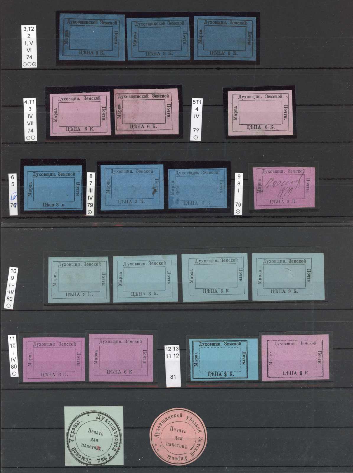 DUKHOVSCHINA: 1874/80, kl. gemischte Sammlung aus Nr. 3 bis 13, ungebr., teils ohne Gummi oder entwertet mit Federzug, in den Hauptnummern nicht kpl., dabei aber viele Werte mehrfach, nach Typen gesammelt, u.a. Nr. 3 (3), 4 (2), 5,