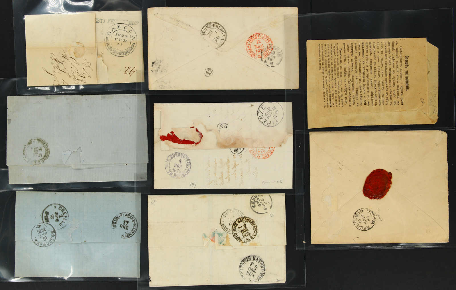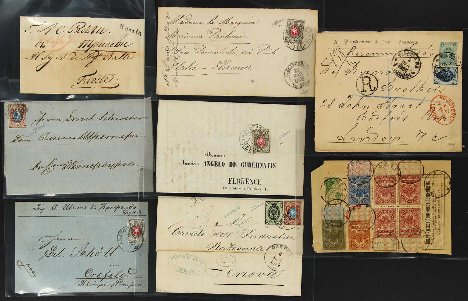 RUSSIA: 1829/1918, selection of covers and stationery envelope sent from Odessa, Warsaw, St. Petersburg and Moscow sent to Italy, Germany and London, total eight items (Image) (imagea)