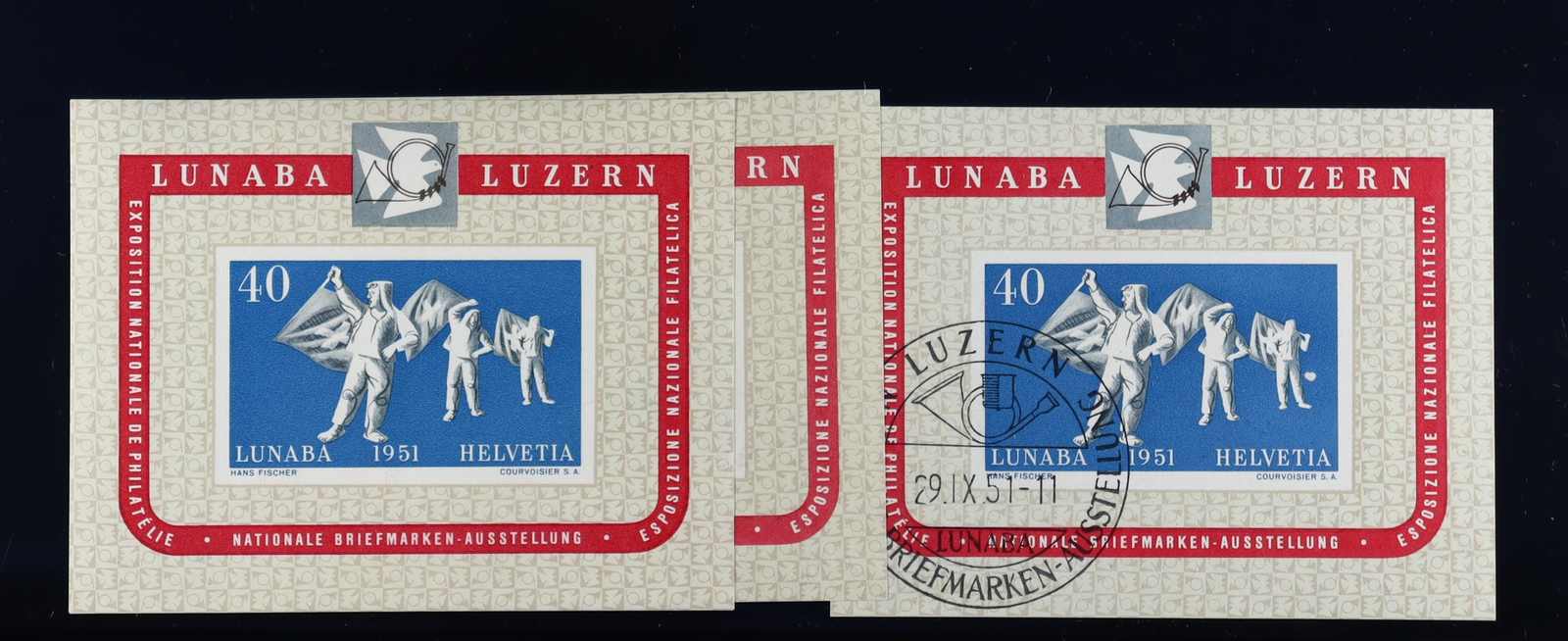 SCHWEIZ: 1951, 3 Blockausgaben LUNABA, 2x postfrisch und 1x gestempelt, auf Nettobasis kalkuliert, einwandfreie Qualität (Image)