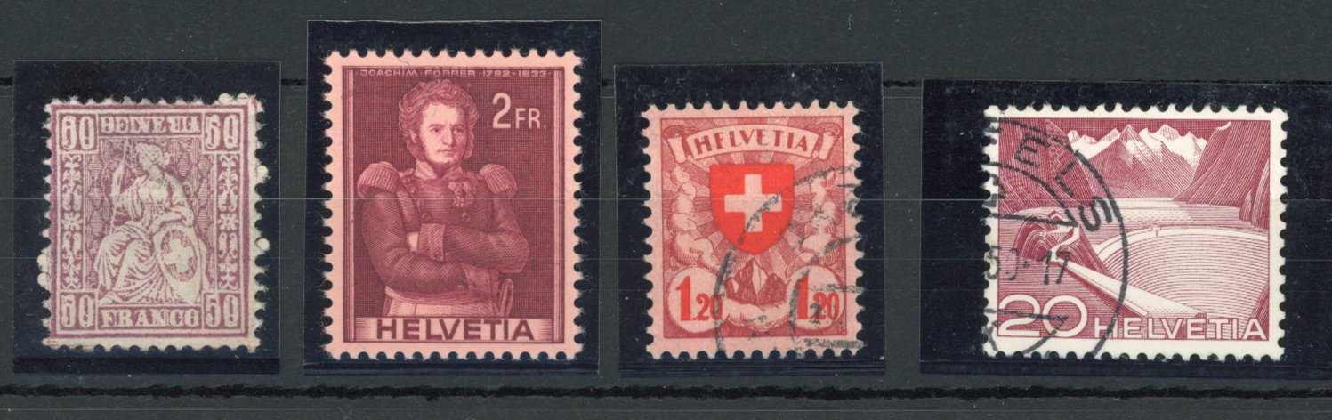 SCHWEIZ: 1881/1949, Zusammenstellung von 4 besseren Druckabarten bzw. -varianten, dabei Mi-Nr. 43 mit zueinander kopfstehendem Doppeldruck ungebr., 195 I gest., 385 DP I ungebr. und 533 I gestempelt, die letzteren 3 Marken geprüft