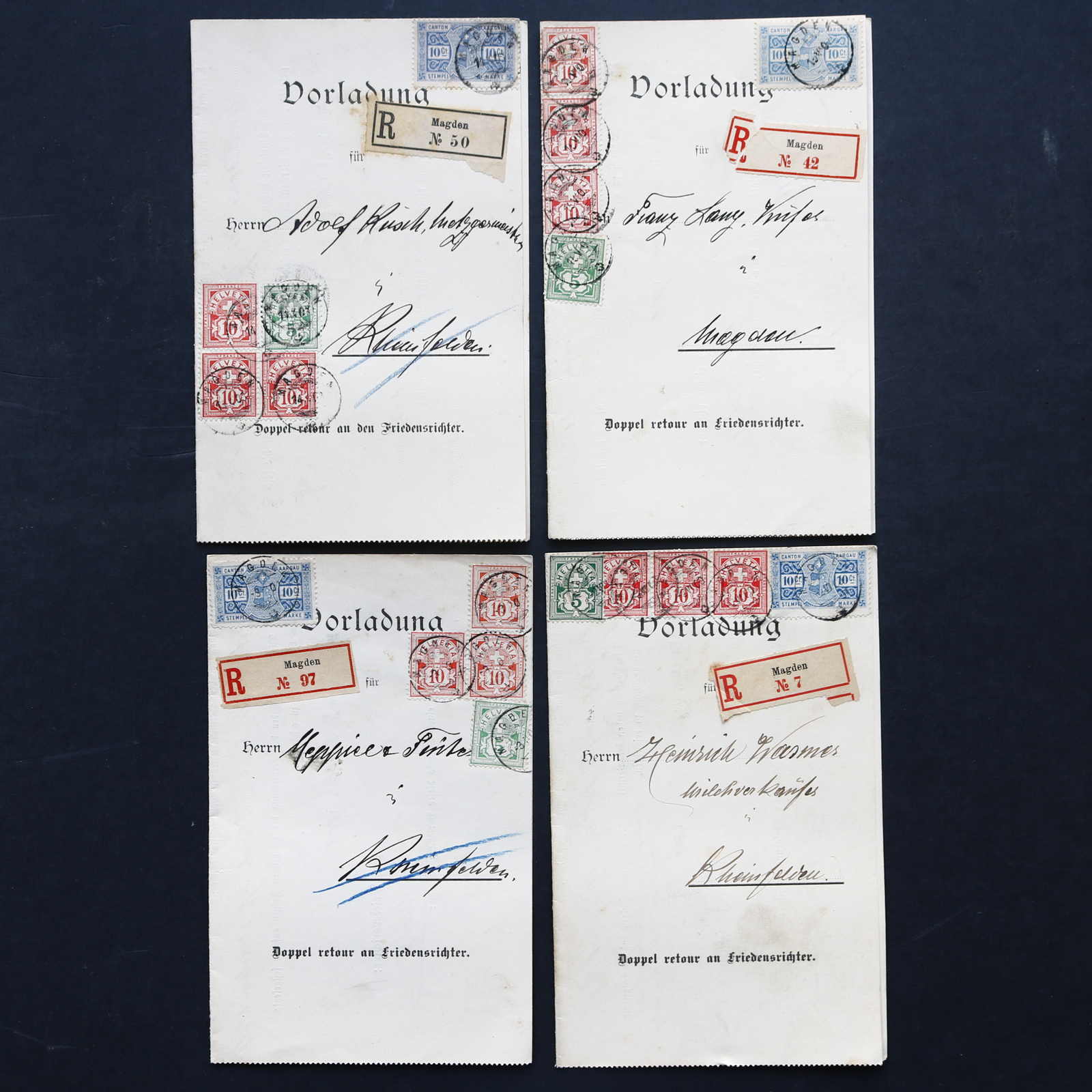 SCHWEIZ: 1909/10, vier Vorladungen zur Verhandlung vor dem Friedensrichter, alle per Einschreiben ab Magden und frankiert mit 3mal 10 und einmal 5 Rp. Schweizerkreuz, jeweils mit blauer 10 Rp. Stempelsteuermarke Kanton Aargau (Image)